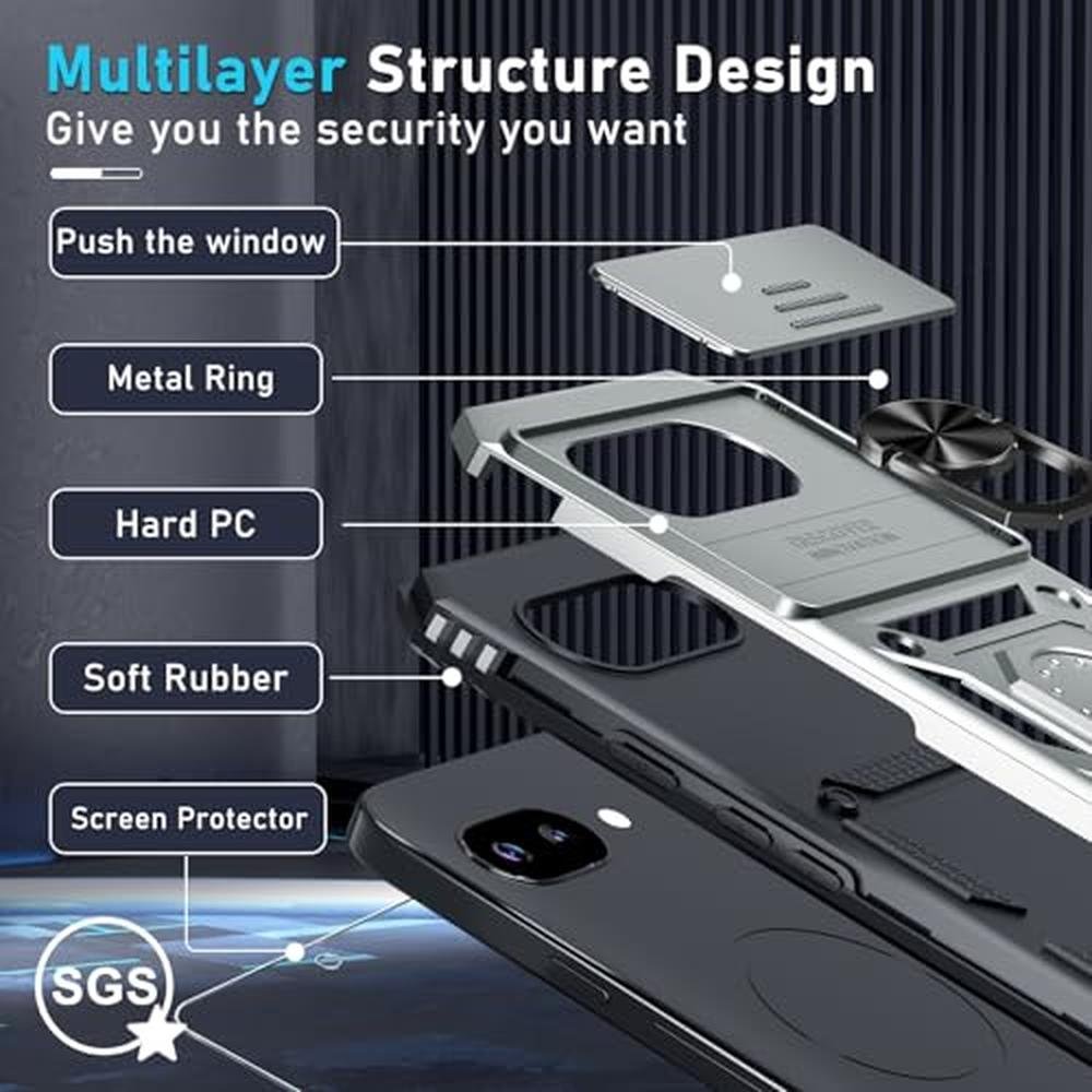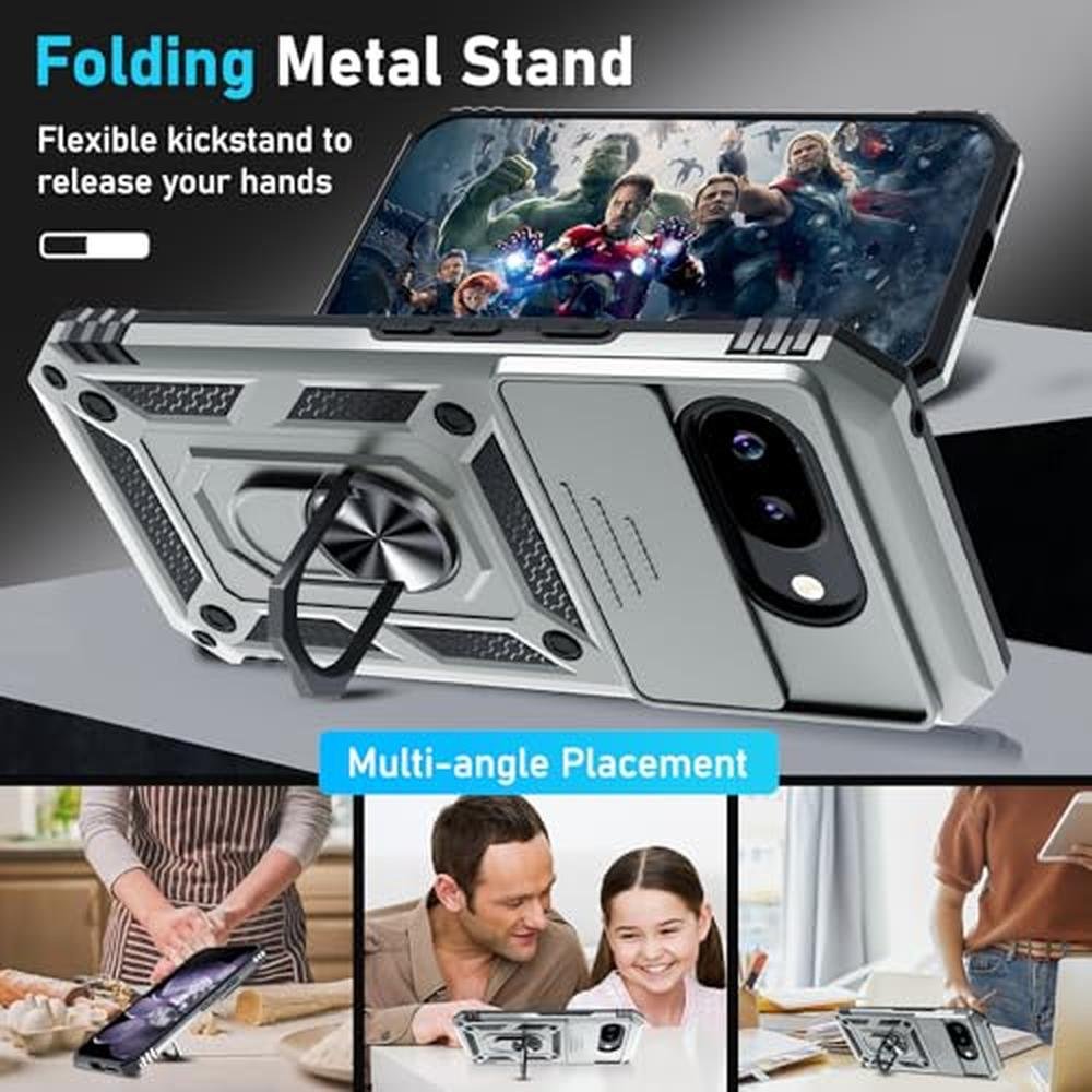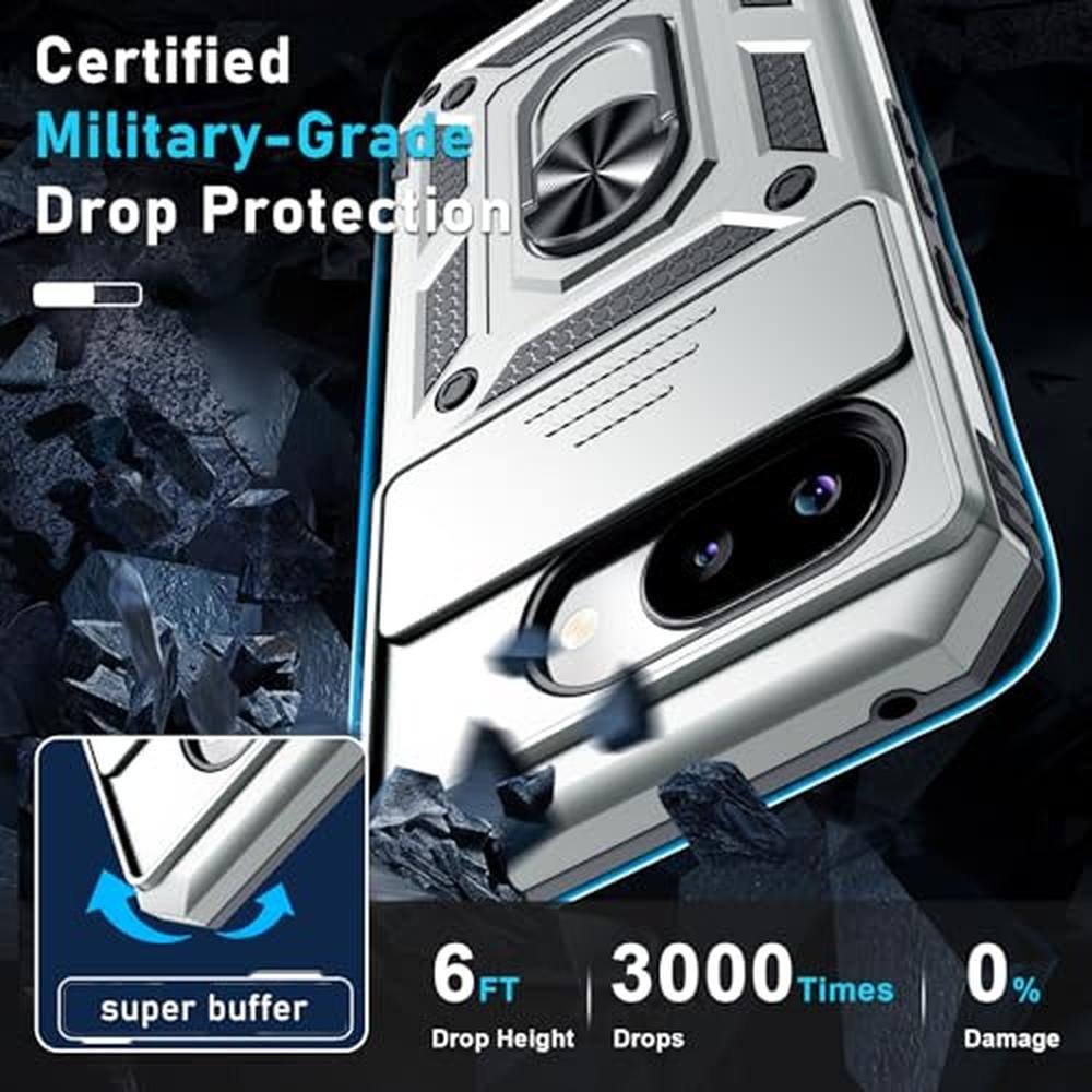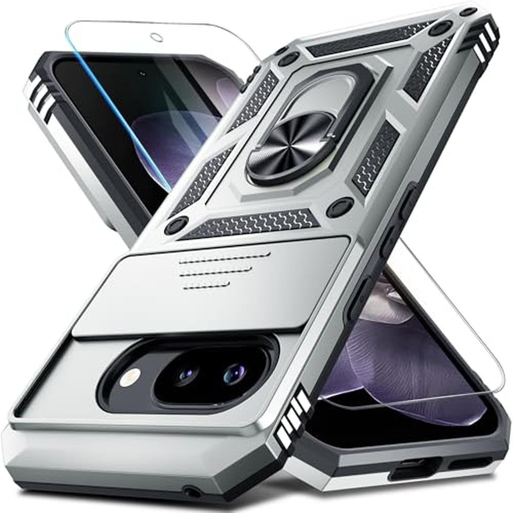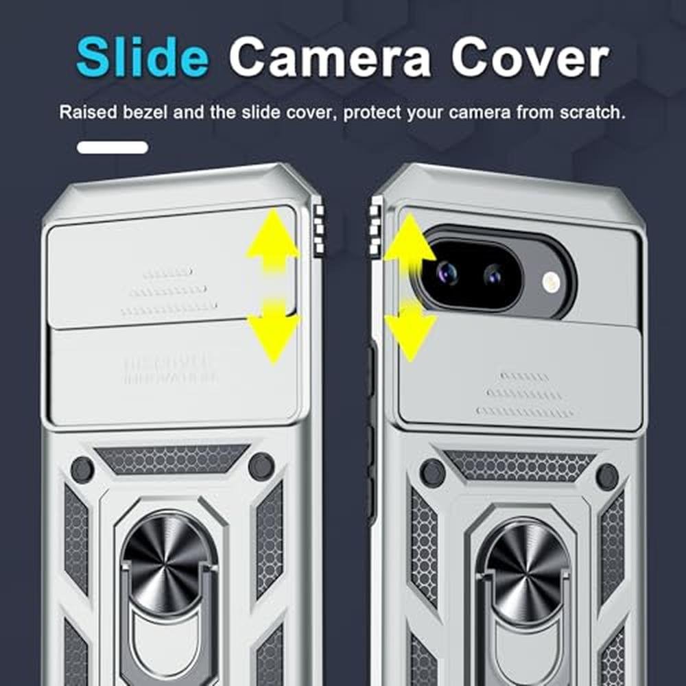 Janmitta Case Compatible with Google Pixel 9A Built in Slide Camera Lens Cover+Screen Protector+Finger Ring Holder Kickstand,Heavy Duty Shockproof Full Body Protective Phone Cover,Silver