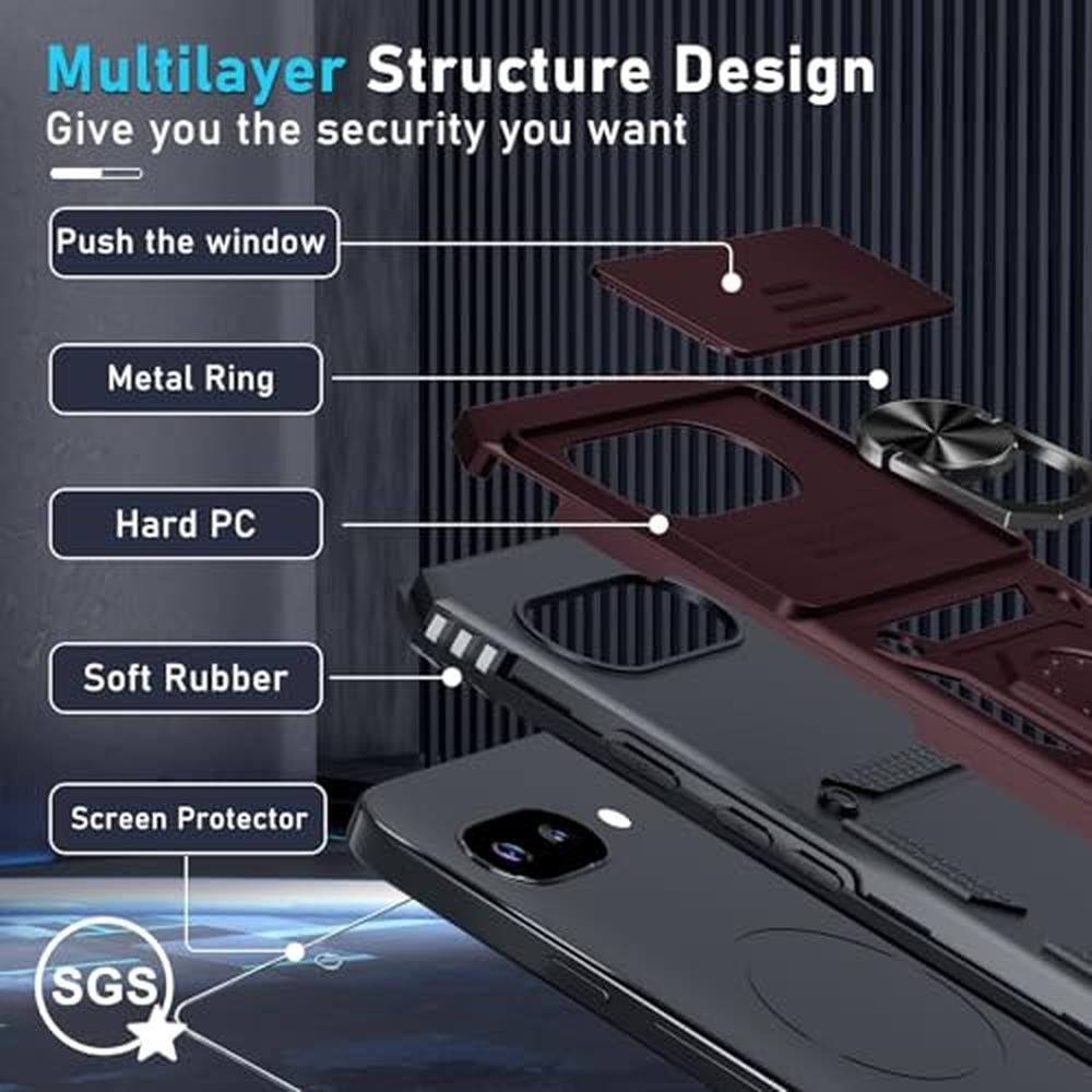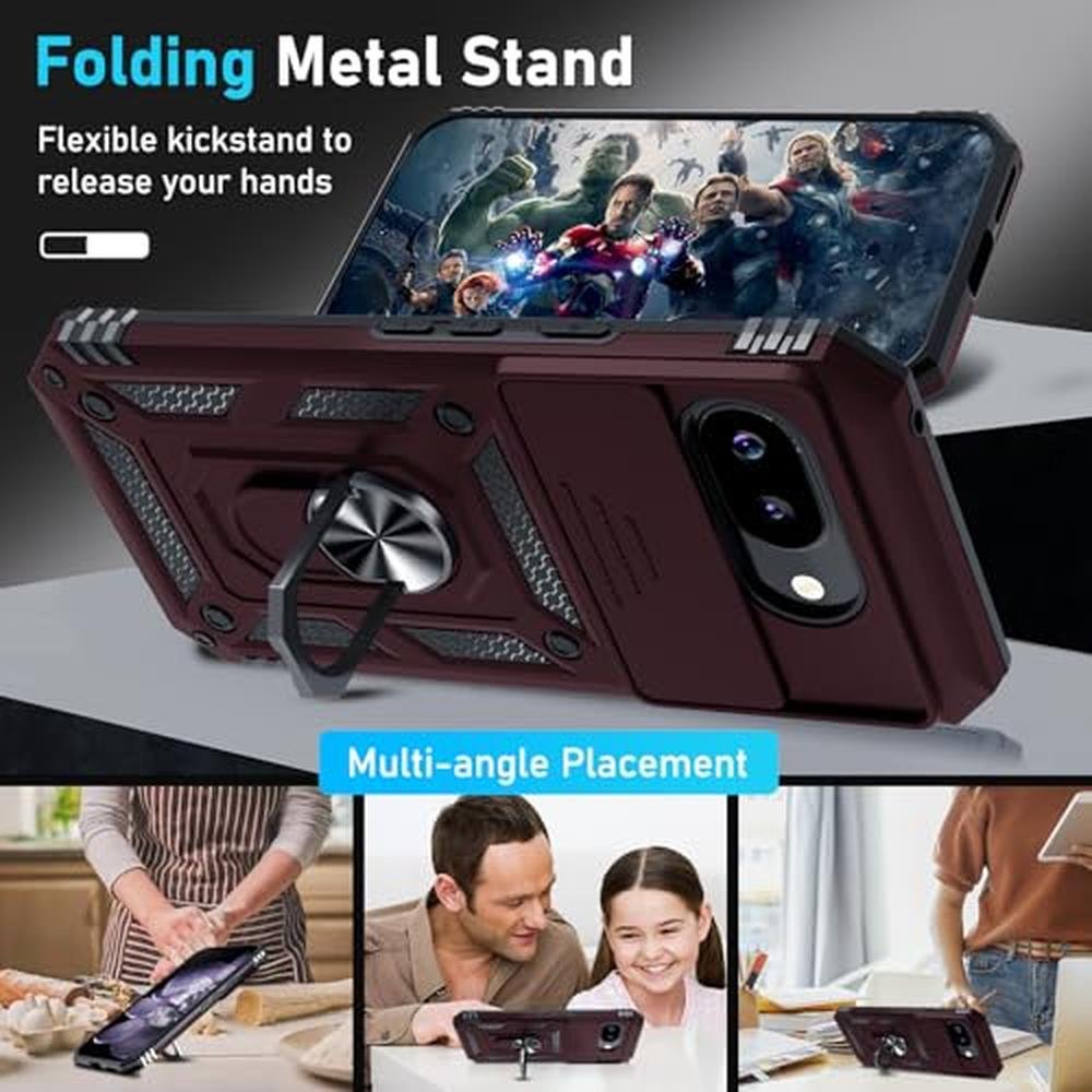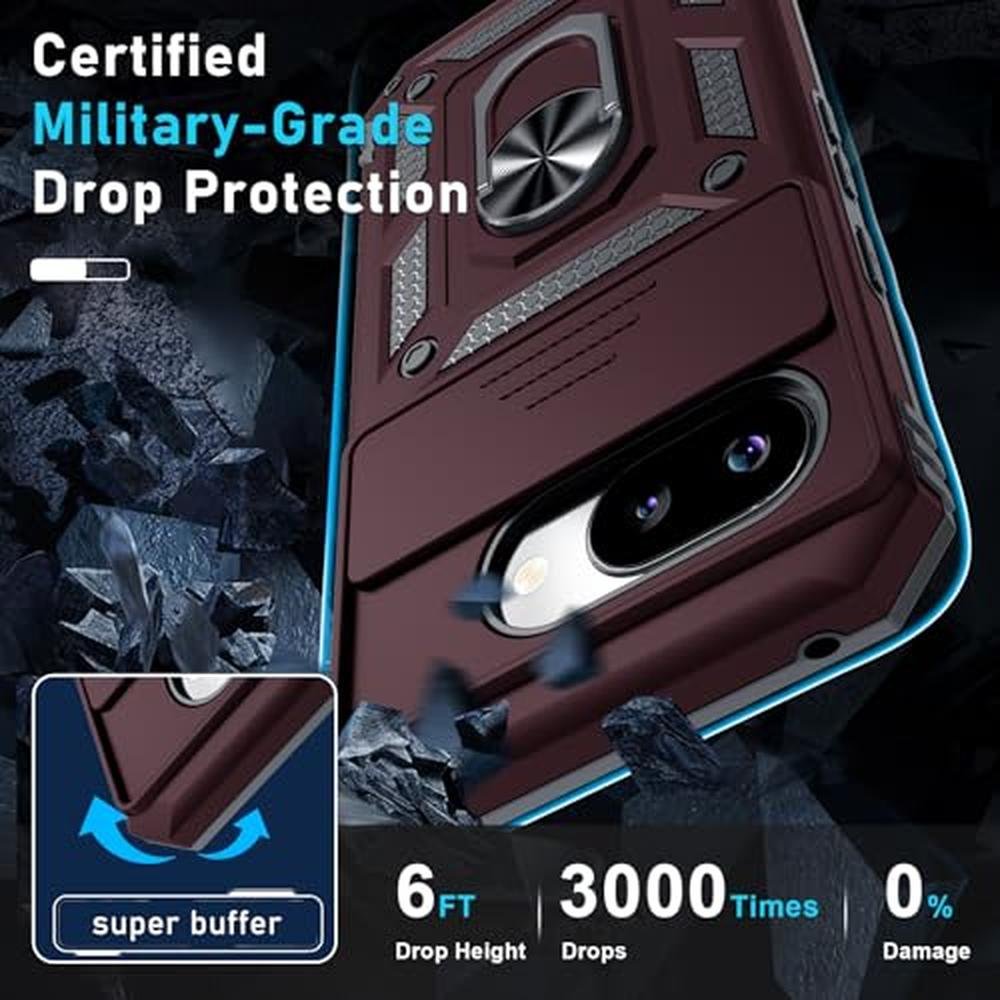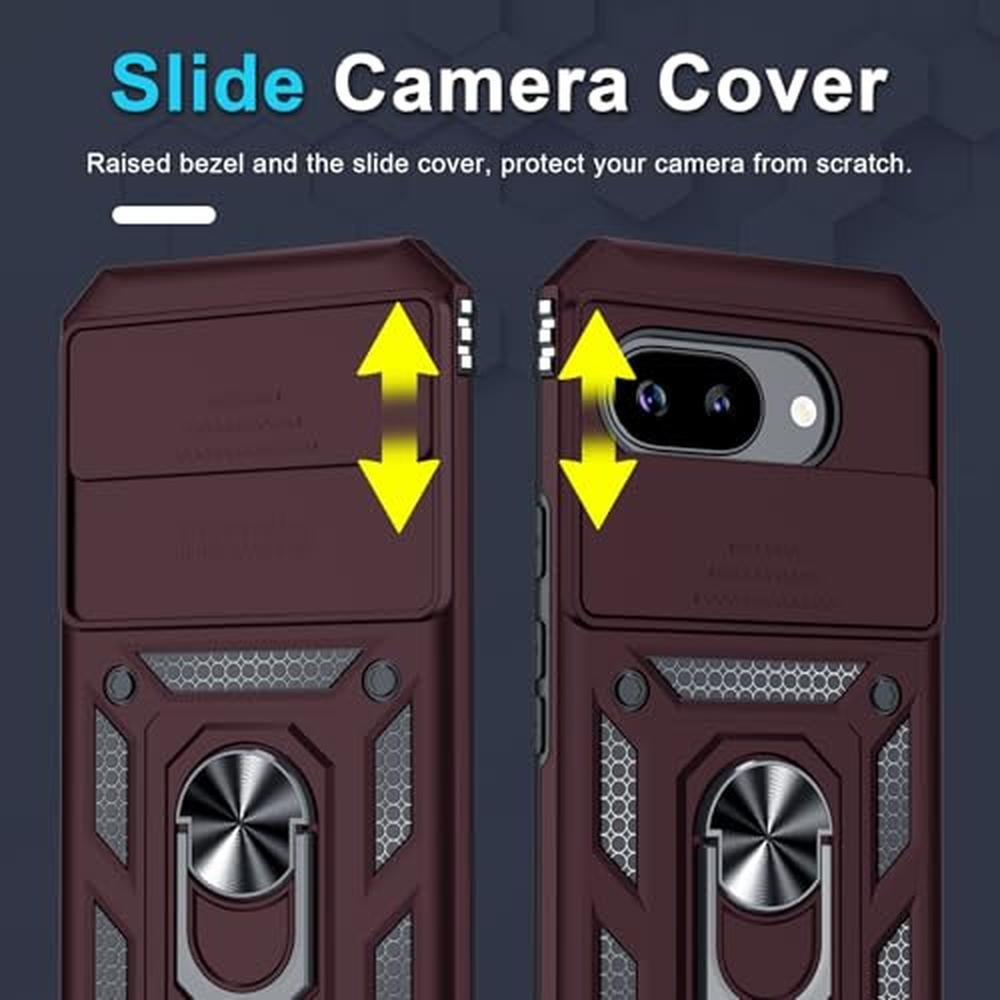 Janmitta Case Compatible with Google Pixel 9A Built in Slide Camera Lens Cover+Screen Protector+Finger Ring Holder Kickstand,Heavy Duty Shockproof Full Body Protective Phone Cover,Wine Red