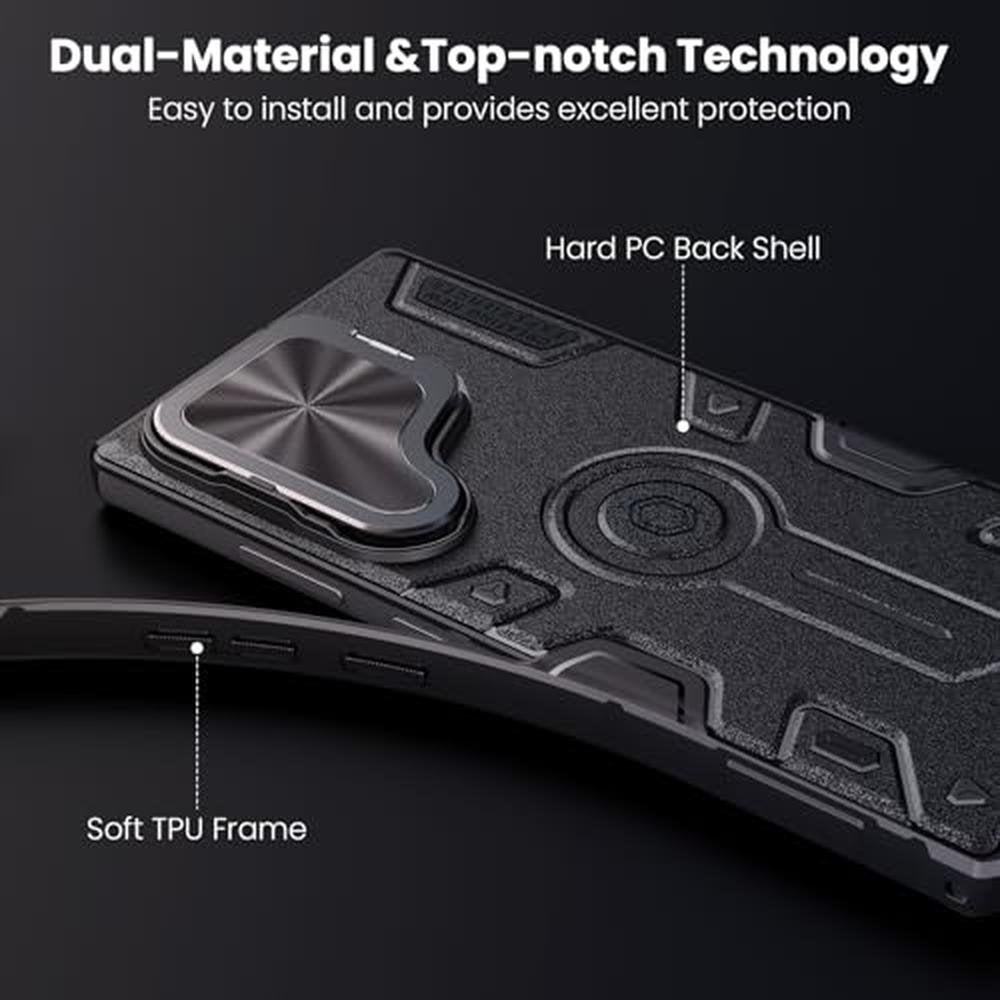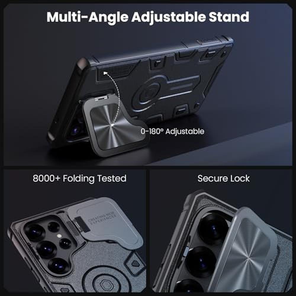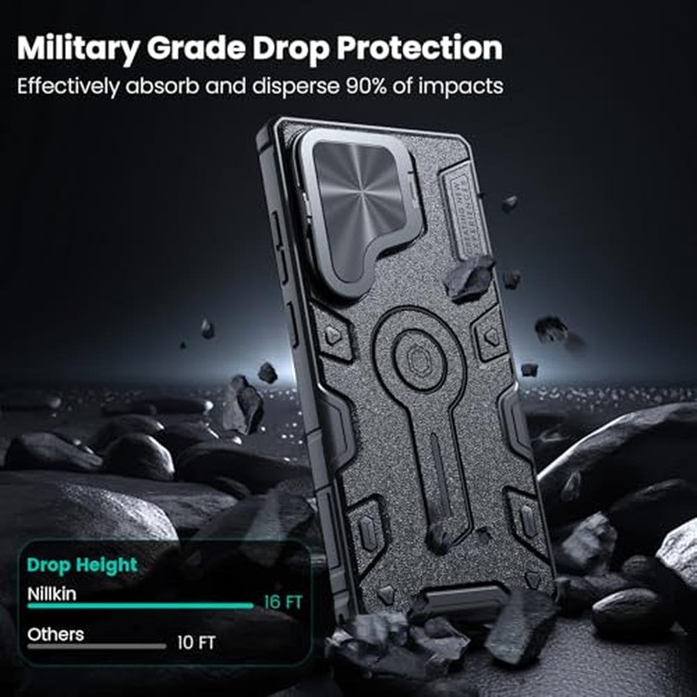 Nillkin for Galaxy S25 Ultra CamShield Armor Prop Case, Drop Tested Magnetic Protective Case with Kickstand and Camera Cover Quality and characteristics: 1.Camera Lens flip Design. 2.Compatible with MagSafe and Most Other Wireless Chargers. 3.Flip Camera cover also as a stand with multiple viewing angles. 4.Military-Grade Protection with Air-Cushion Technology for all corners, and all around protection for your device. 5.Precise Cutouts and easy access to all ports, buttons Package Included: 1 Pcs Samsung Galaxy S25 Ultra (Black).