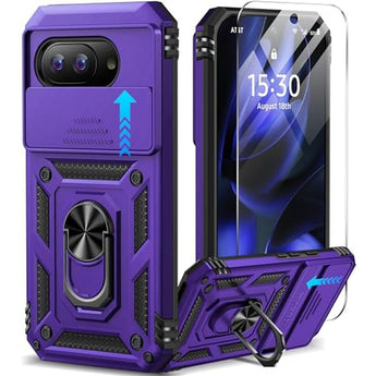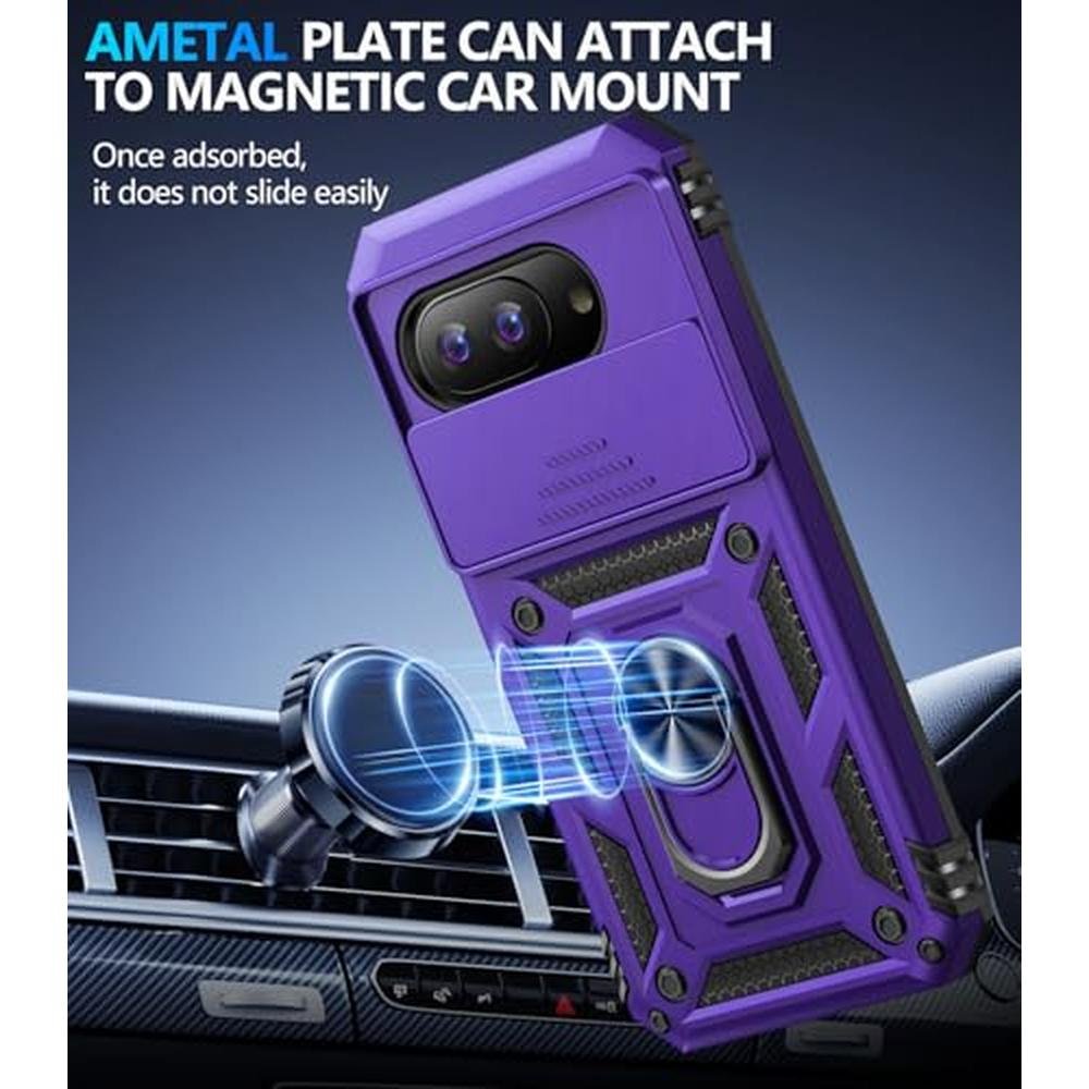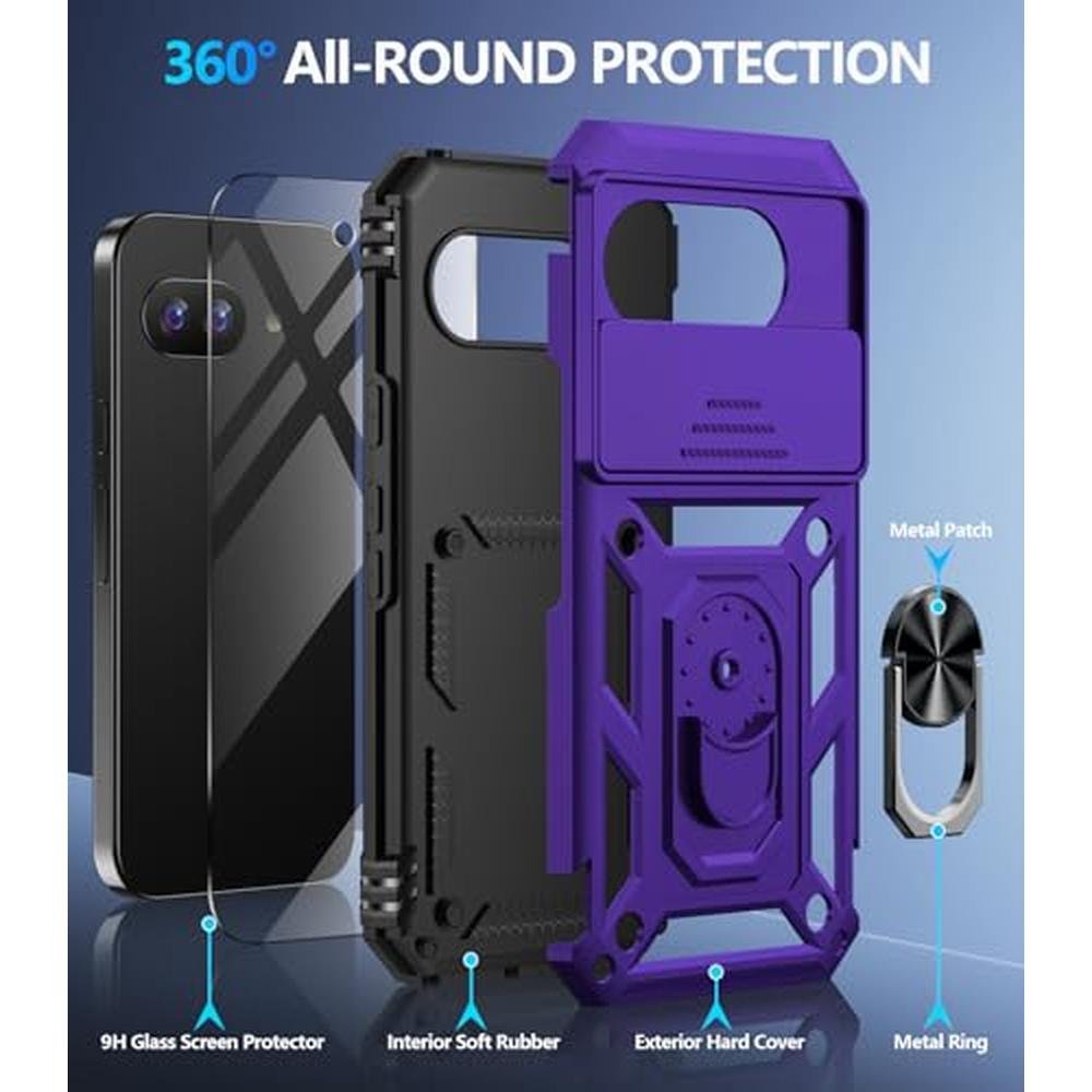 Taisairu for Google Pixel 9A Case with Screen Protector & Slide Camera Lens Cover, Built-in 360Rotate Magnetic Ring Stand Shockproof Protective Phone Case for Google Pixel 9A Case (Purple)