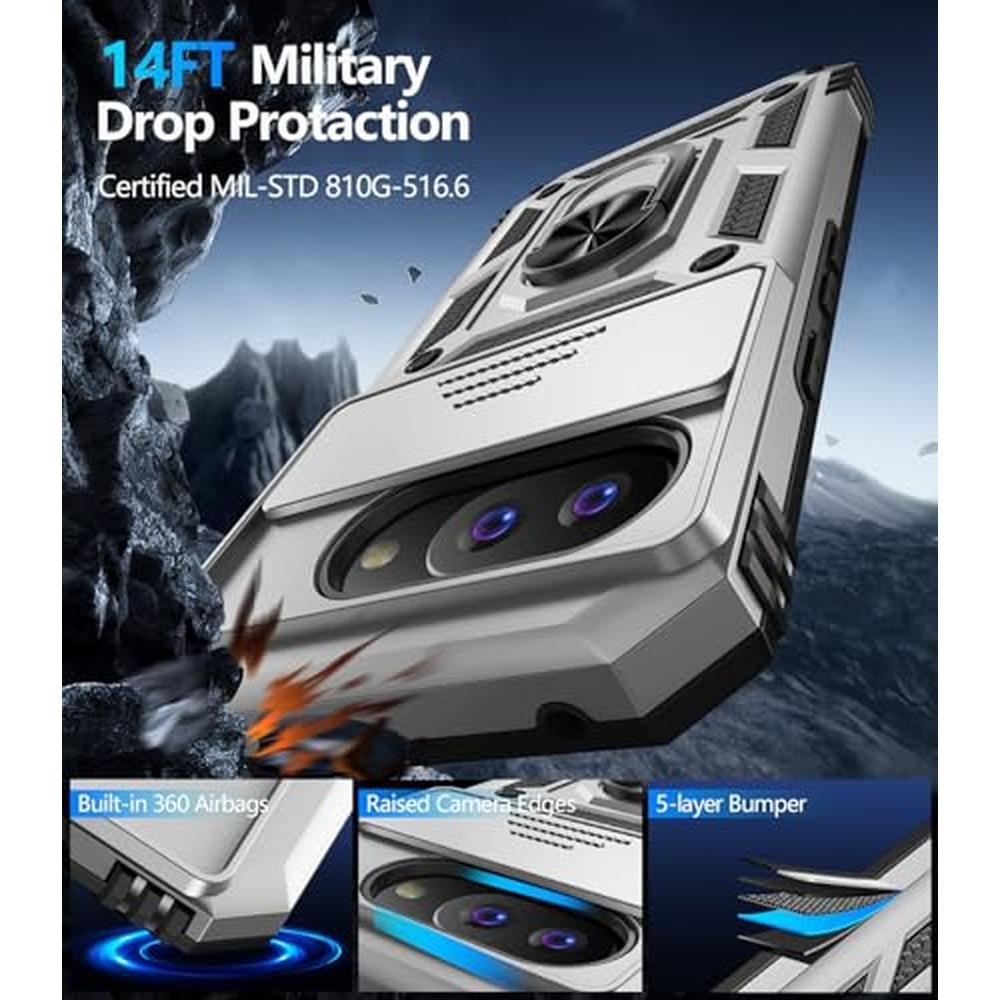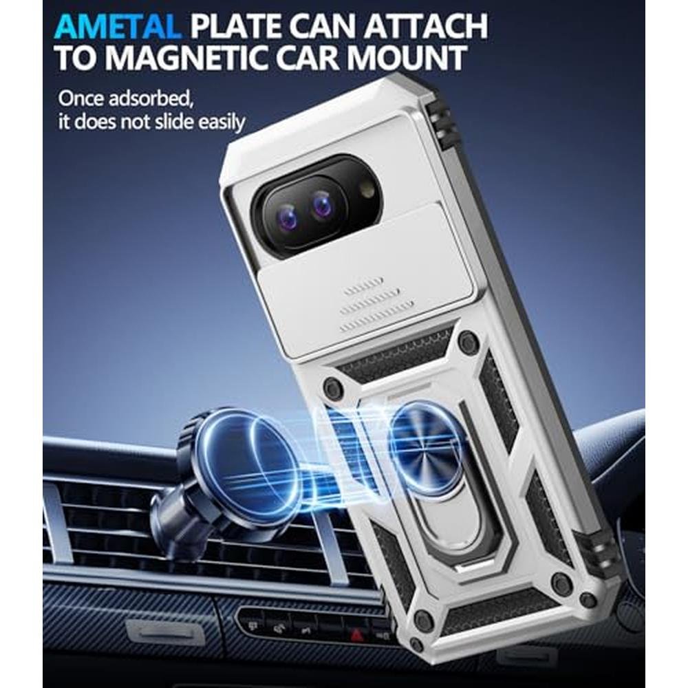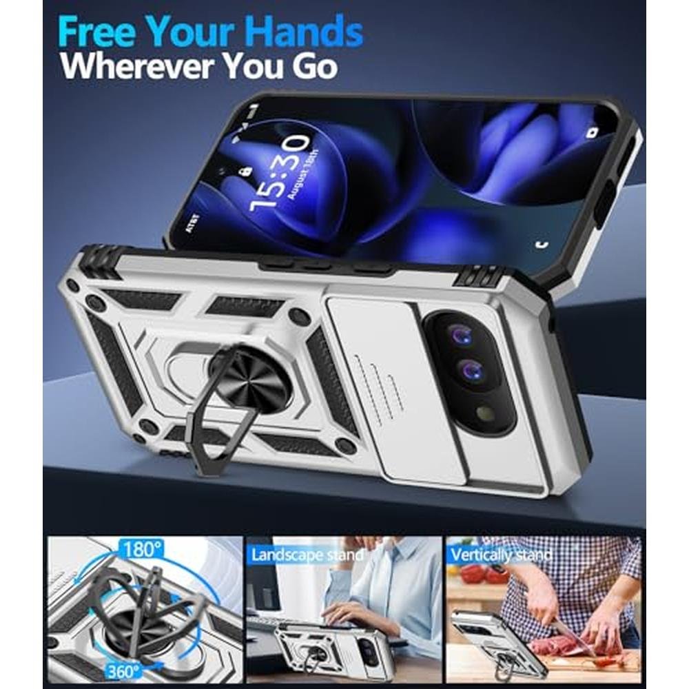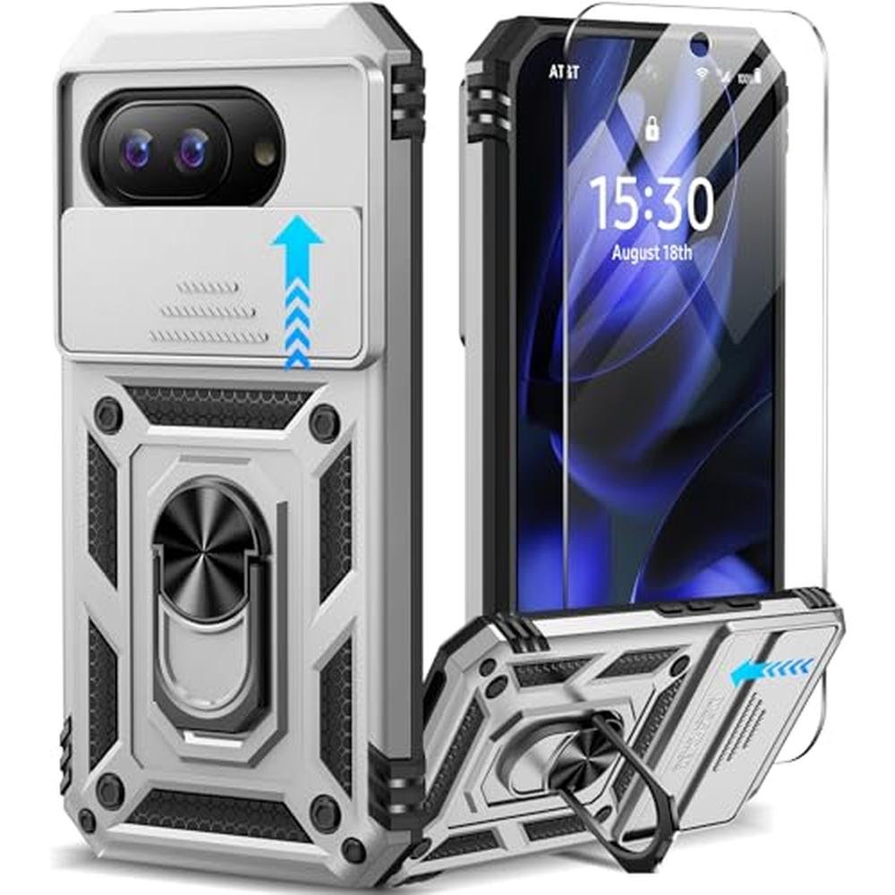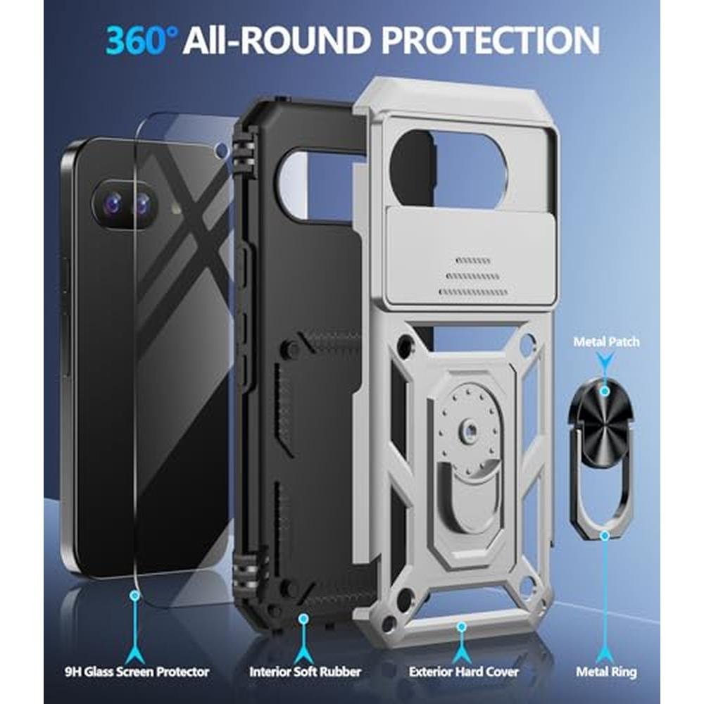 Taisairu for Google Pixel 9A Case with Screen Protector & Slide Camera Lens Cover, Built-in 360Rotate Magnetic Ring Stand Shockproof Protective Phone Case for Google Pixel 9A Case (Silver)