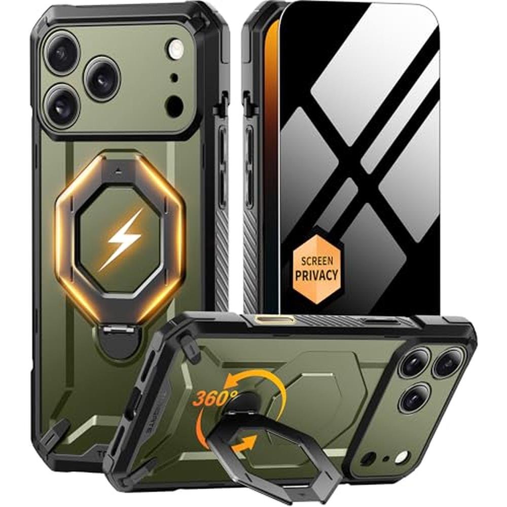 TONGATE for iPhone 17 Pro Max Case with 360 Spin Magnetic Stand, [Compatible with MagSafe] [Military Grade Drop Protection] Built-in Ring Holder & Screen Protector for iPhone 17 Pro Max,Green Privacy