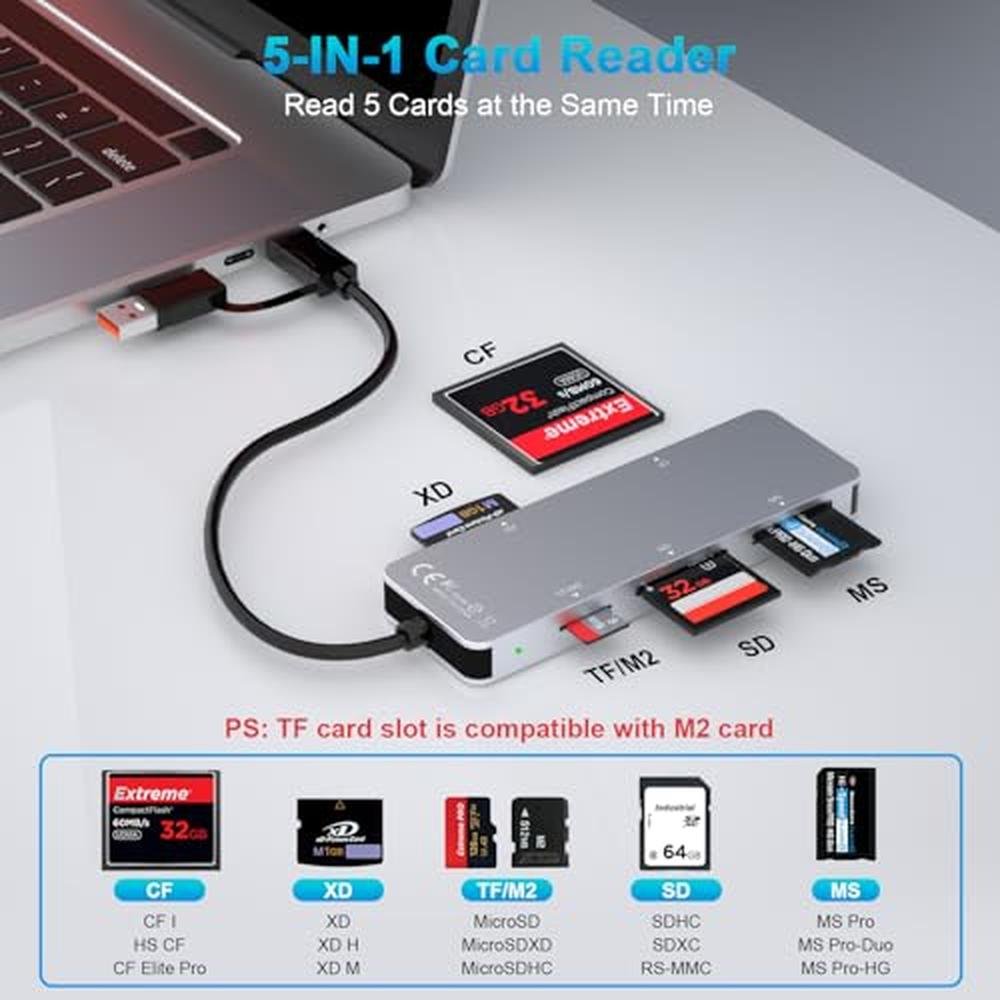 Experience the pinnacle of reader memory solutions with our 5-in-1 USB 3.0 Card Reader, expertly designed to read multiple memory cards simultaneously, including TF, SD, MS, M2, XD, and CF. As a sophisticated memory reader for iPhone and other devices, this adapter supports both USB A and USB C connections, ensuring compatibility with a wide range of devices, including iPhone 16, 15, PC, and Android. With its exceptional 5Gbps transfer speed, you can effortlessly access your files and transfer data, streamlining your workflow and saving valuable time. This premium-grade reader memory stick pro duo adapter enables you to read up to 5 cards at once, making it an indispensable tool for professionals and enthusiasts alike.