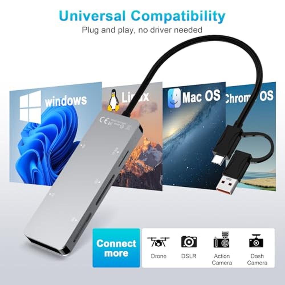 Elevate your productivity with the universal connectivity offered by this adapter, featuring a USB-C port for USB-C devices, including iPhone 15 and 16, and a USB-A port for computers. The plug-and-play design requires no drivers, supporting bidirectional transmission for effortless data transfer. The professional-grade build boasts a durable aluminum construction, compact portable design, and supports reading memory cards up to 2TB in capacity, making it an ideal solution for photographers, videographers, and professionals managing multiple card types.