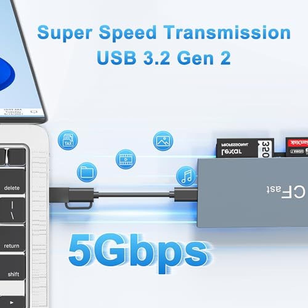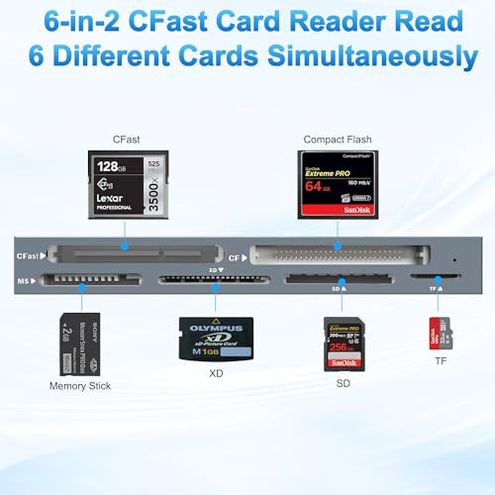 - Supports up to 6 different memory cards, including CFast, SD, TF, MS, XD, and CF CompactFlash cards, for versatile data transfer options
