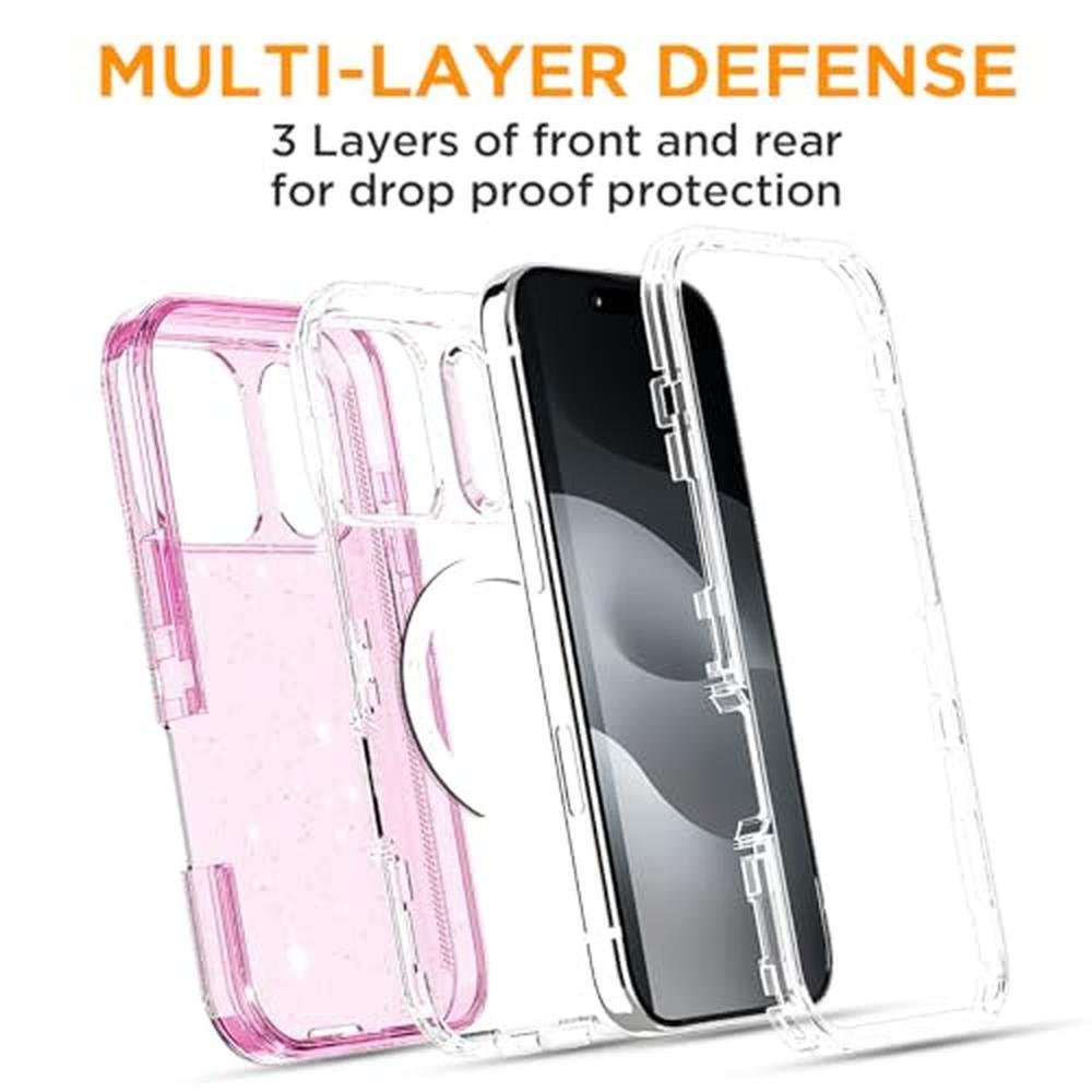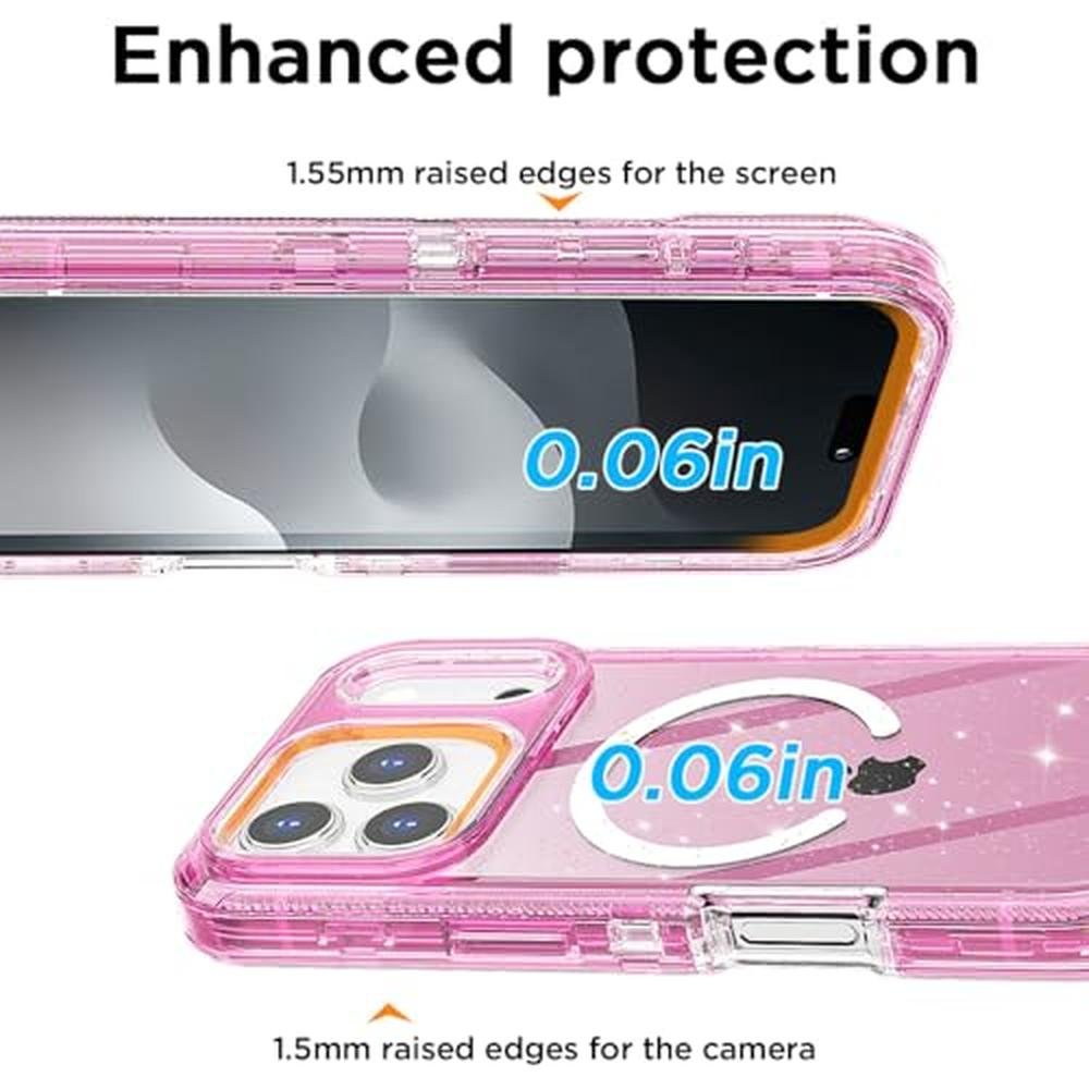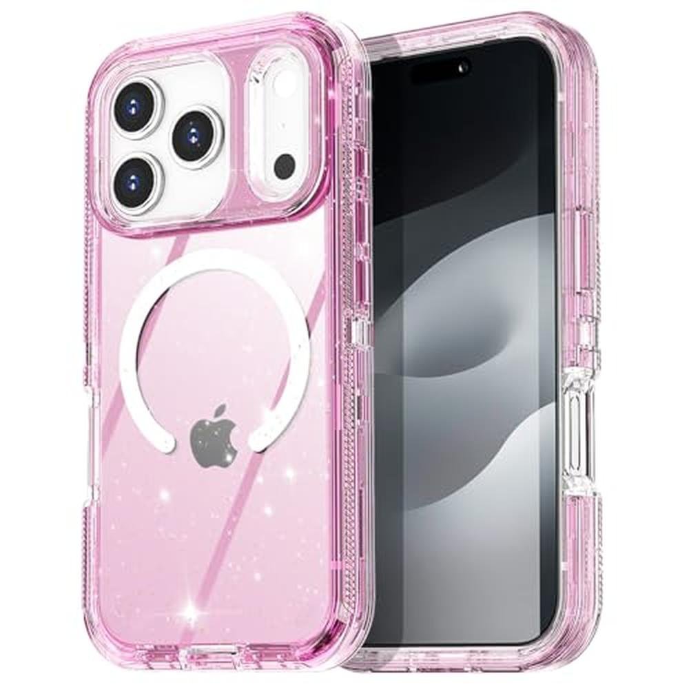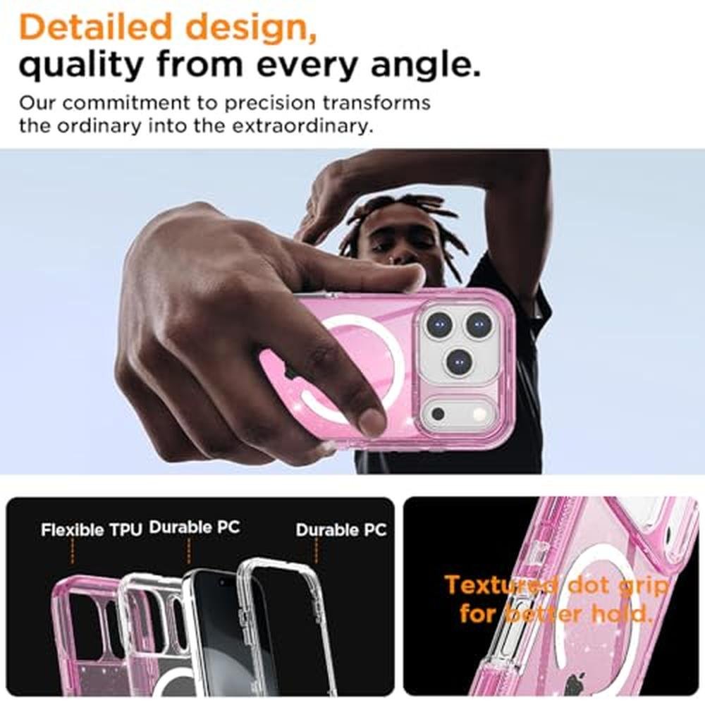 - Stronger Magnetic Lock and Long-lasting Crystal Clear: powerful built-in magnets with 1,500 g of holding force enable faster, easier place-and-go wireless charging and provide a secure lock on any MagSafe accessory.This iphone 17 Pro glitter case is made of hard PC backplate and soft TPU frame, maintains crystal-clear clarity for the long haul.