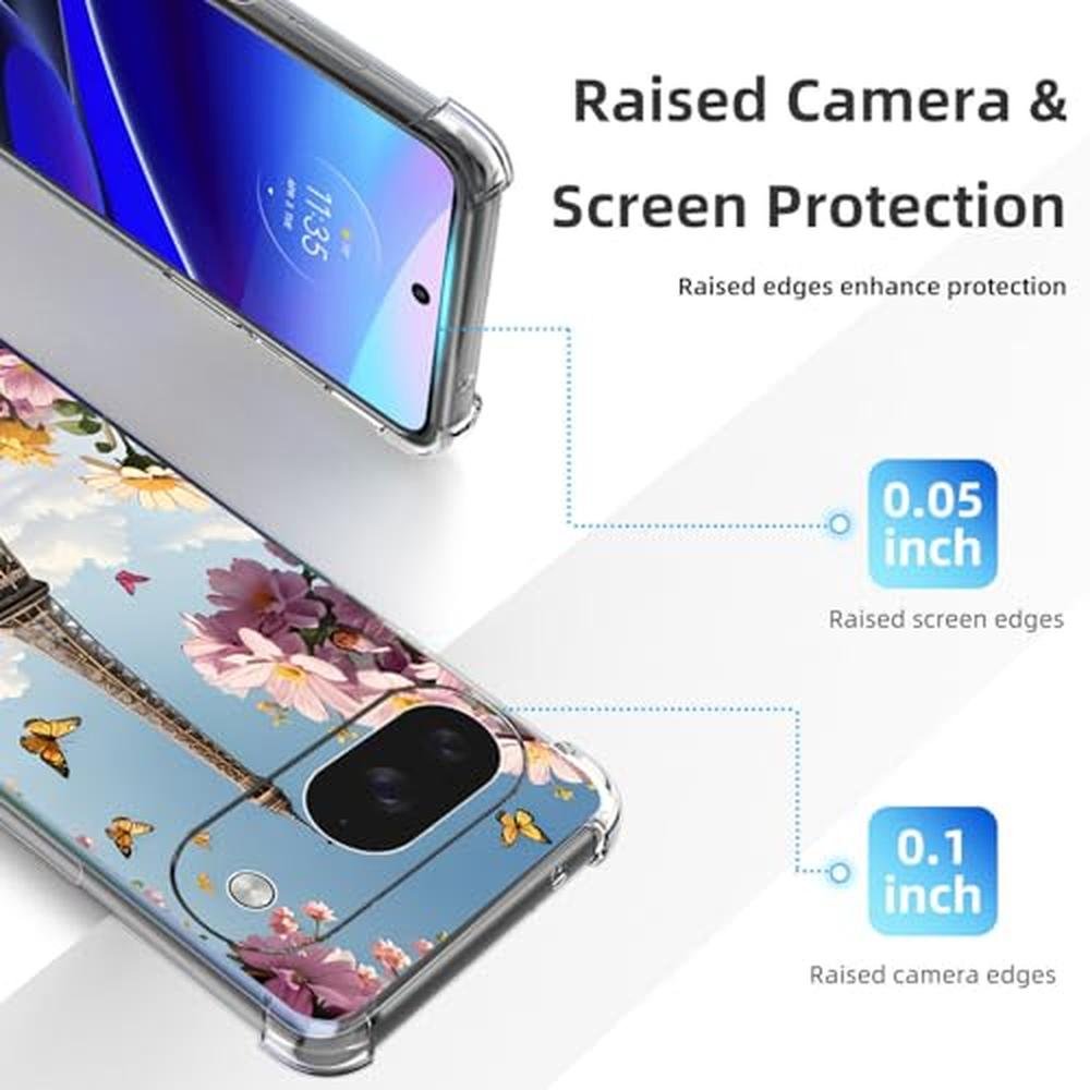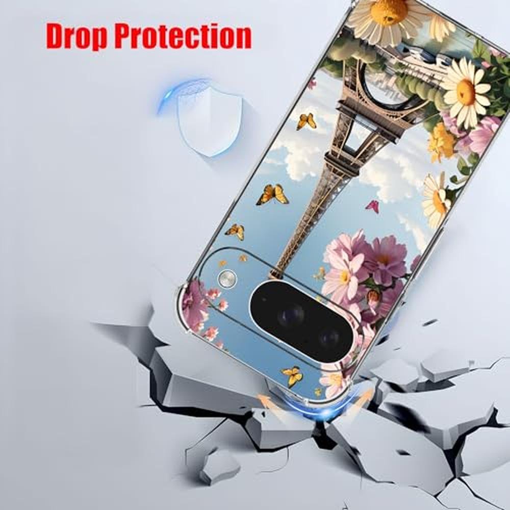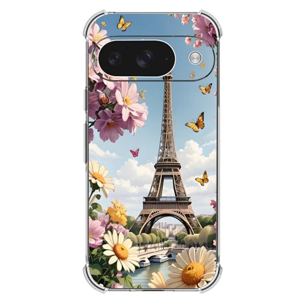 Beaucov Case for Pixel 9,Eiffel Tower Butterfly Flowers Drop Protection Shockproof Case TPU Full Body Protective Scratch-Resistant Cover for Google Pixel 9