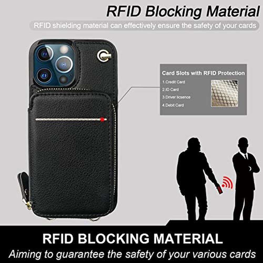 Bocasal Crossbody Wallet Case for iPhone 13 Pro Max, RFID Blocking Leather Purse Case with Card Holder, Protective Handbag Flip Cover with Zipper Wrist Strap Lanyard for Women 5G 6.7 Inch (Black)