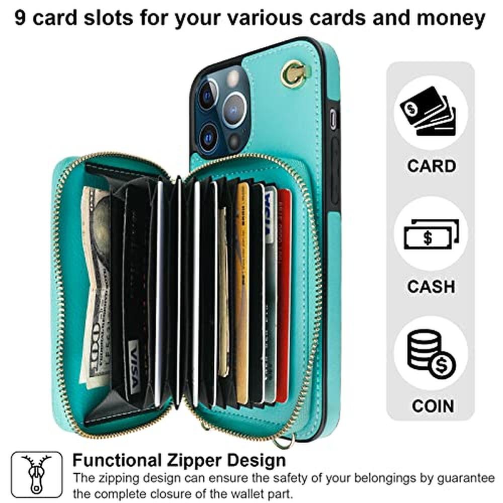 - Large Capacity Case Wallet Given the frequent usage of many cards in our daily life, we designed this large capacity flip cover case with 10 card slots that can contain some cash and your various cards such as credit card, ID card, driver s license, and so on. Besides, the zippered design ensures complete closure to keep your belongings safe.