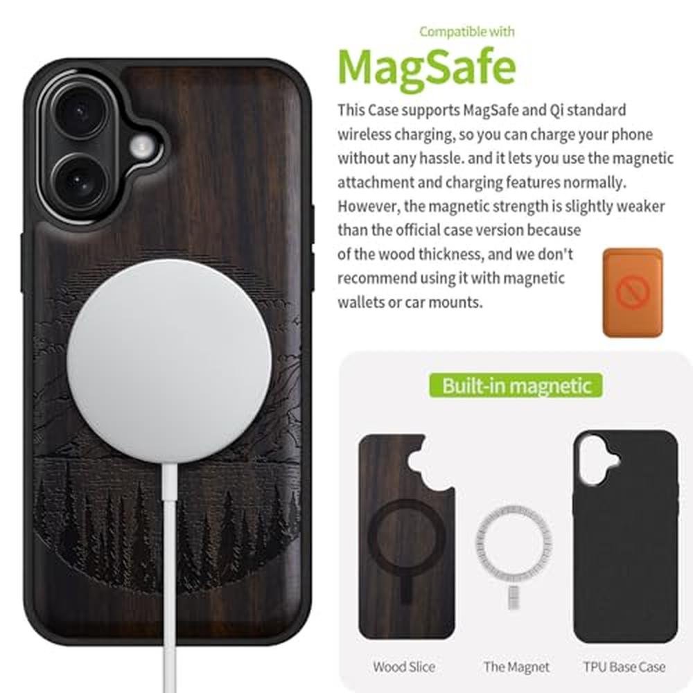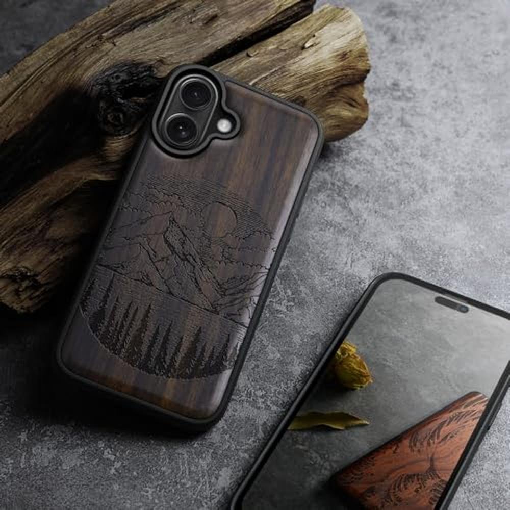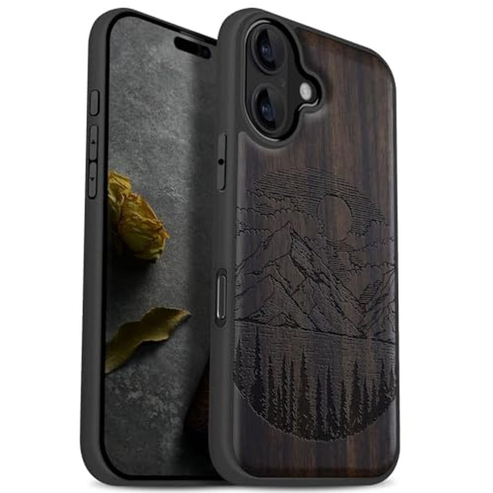 Carveit Magnetic Wooden Case for iPhone 17 Case, Wood Artisan Engraved & Black Soft TPU Shockproof Cover, Compatible with MagSafe Wireless Chargers (Alpine Lakes) Blackwood
