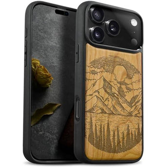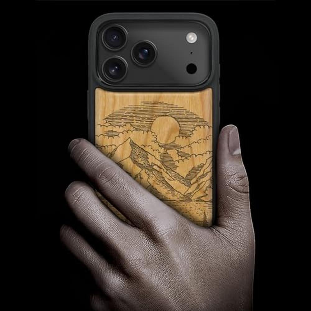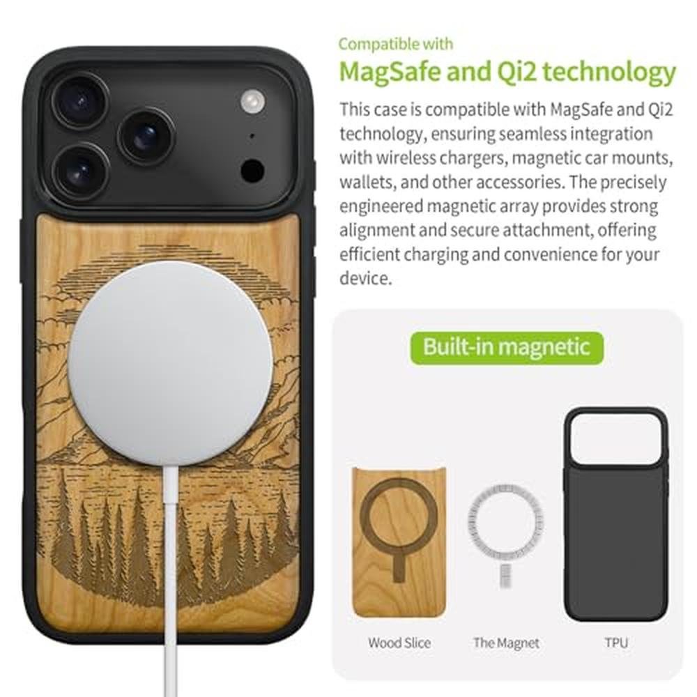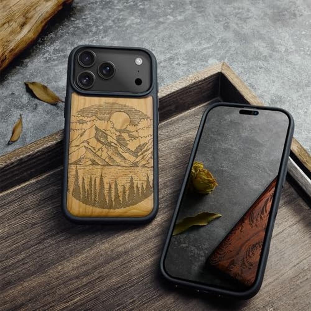 Carveit Magnetic Wooden Case for iPhone 17 Pro Case, Wood Artisan Engraved & Black Soft TPU Shockproof Cover, Compatible with MagSafe Wireless Chargers (Alpine Lakes) Cherry