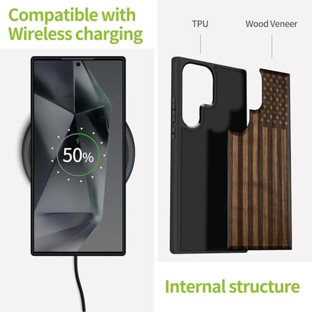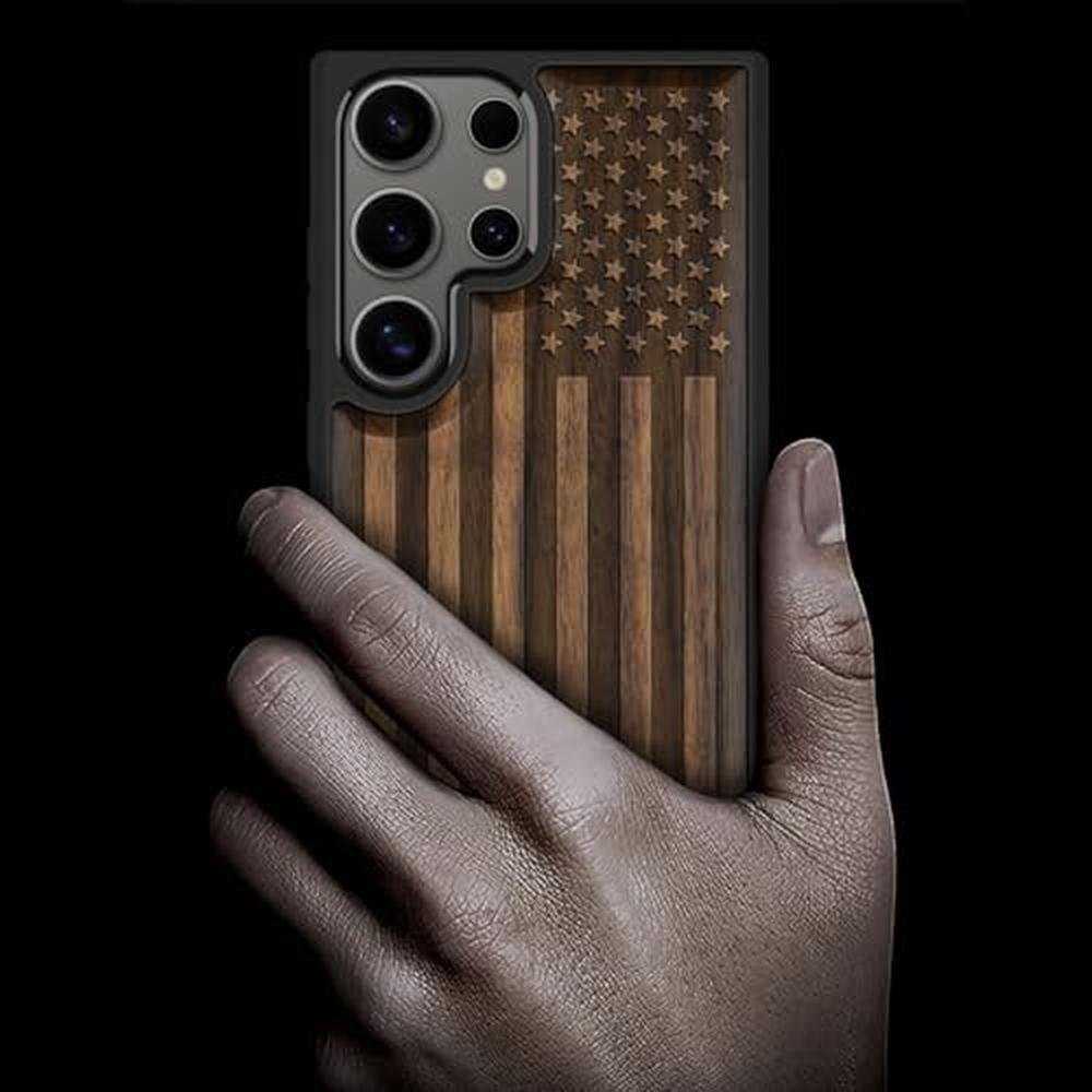 Carveit Wood Case for Galaxy S25 Ultra Case 2025 [Natural Wood & Black Soft TPU] Shockproof Protective Cover Unique Wooden Design Compatible with Samsung S25 Ultra (American Flag-Walnut)