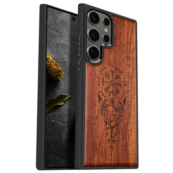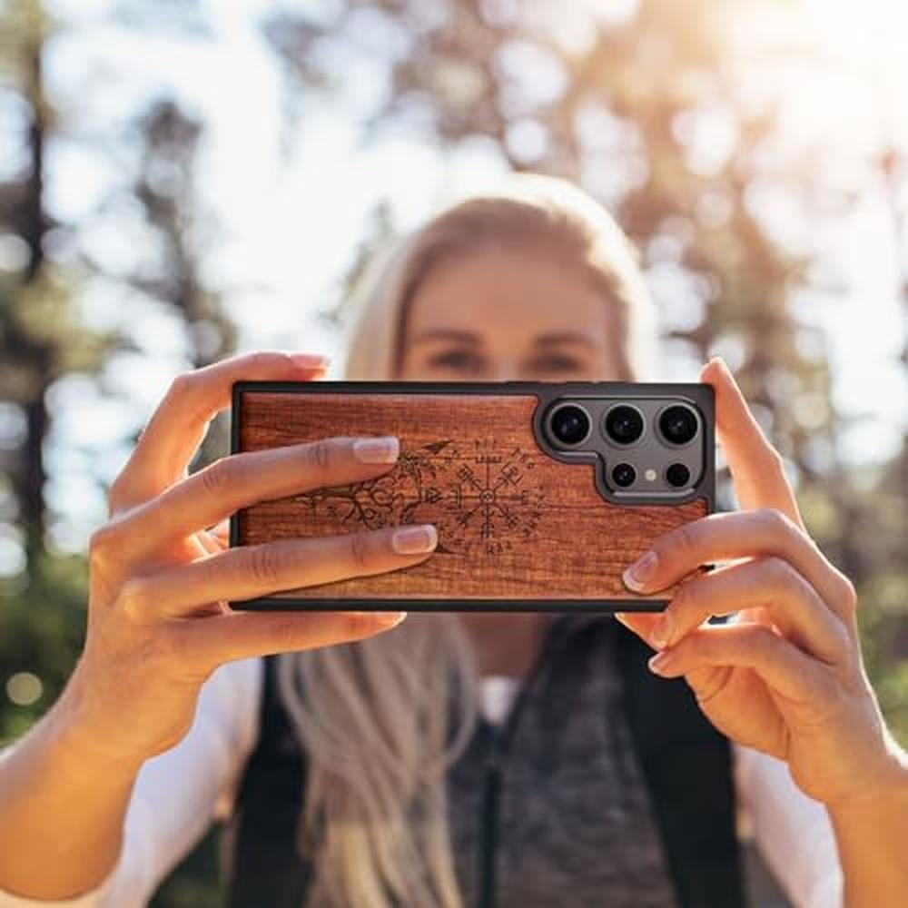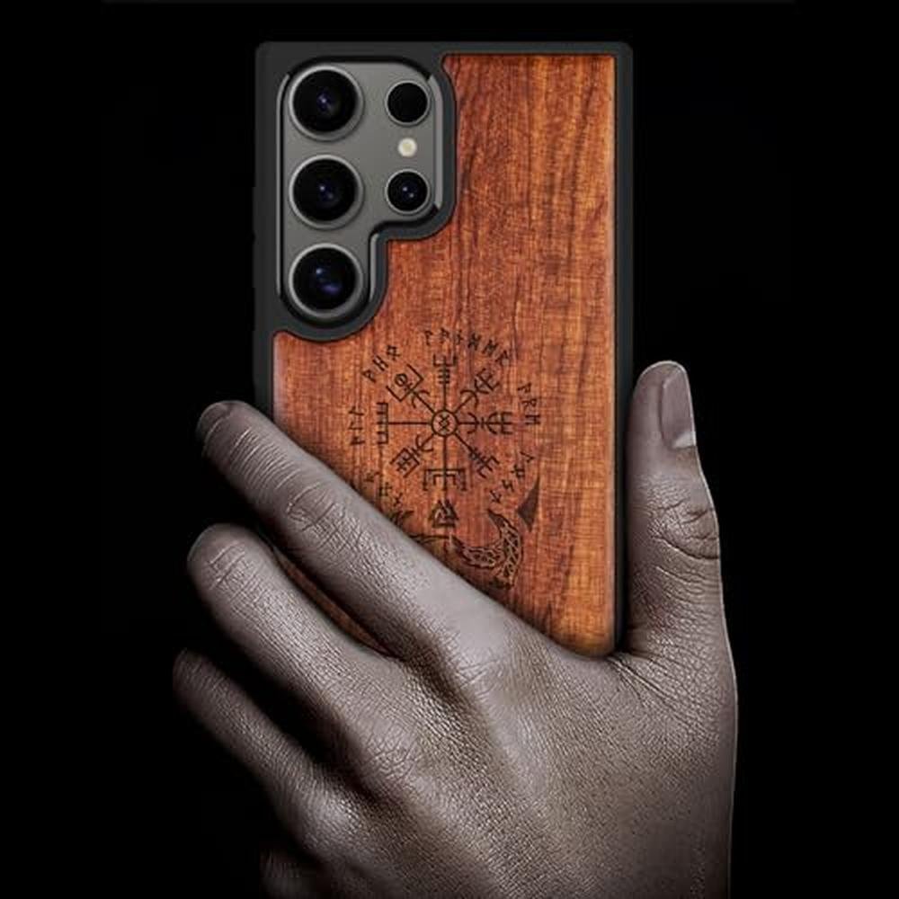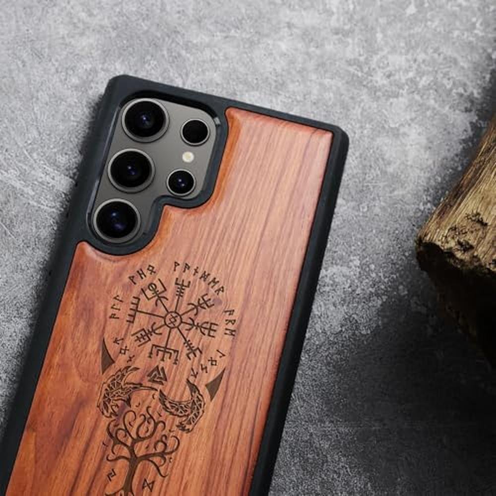 Carveit Wood Case for Galaxy S25 Ultra Case 2025 [Natural Wood & Black Soft TPU] Shockproof Protective Cover Unique Wooden Design Compatible with Samsung S25 Ultra (The Guiding Vegvisir-Rosy)