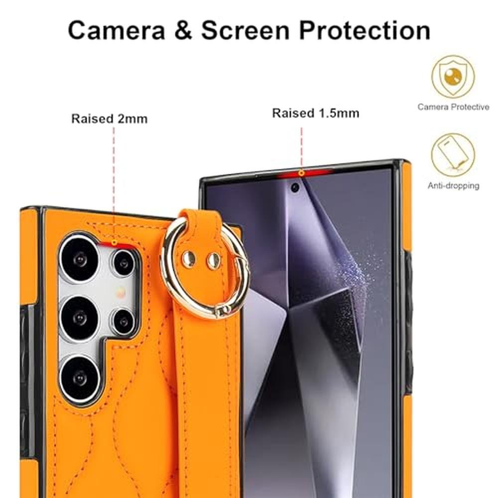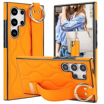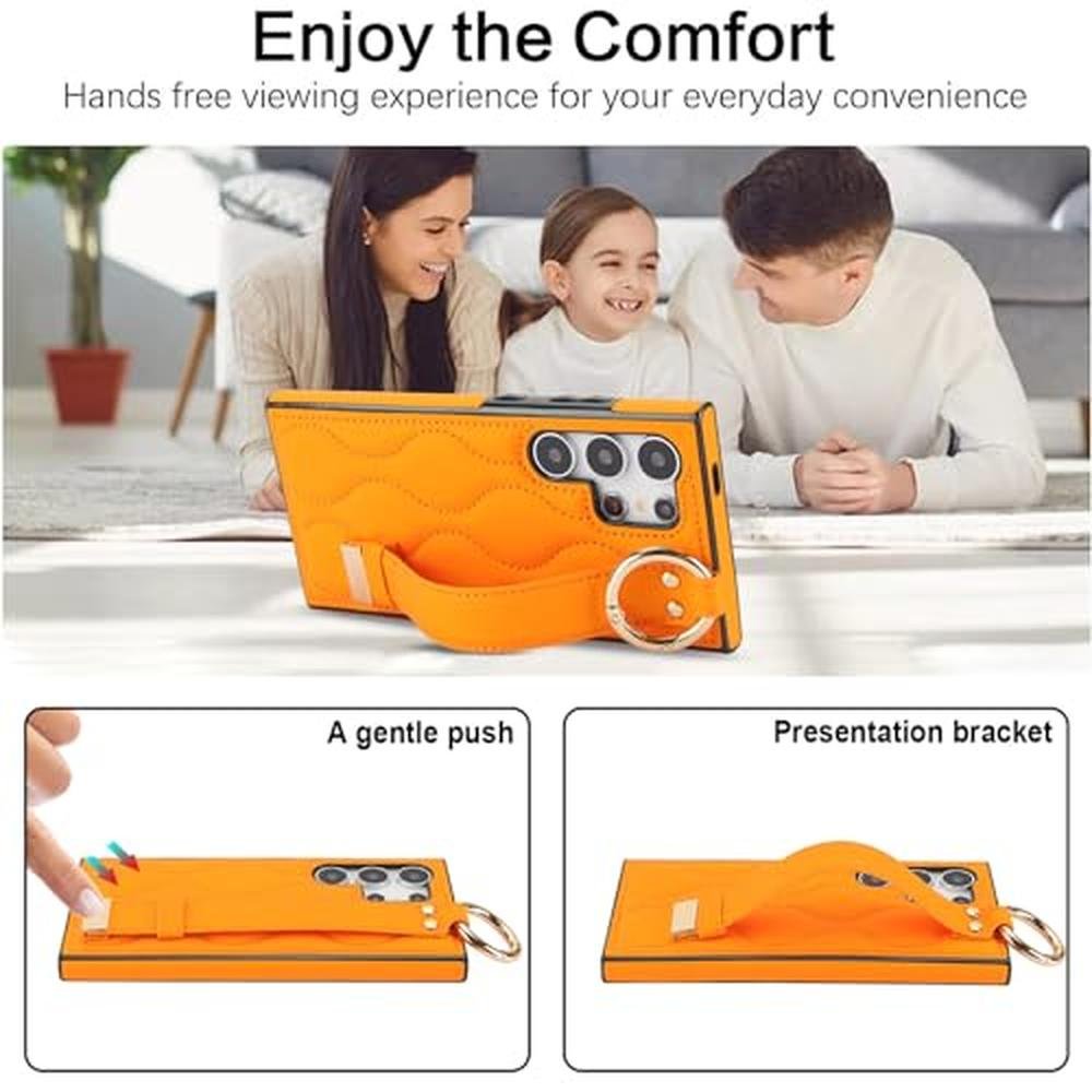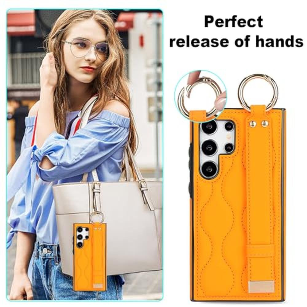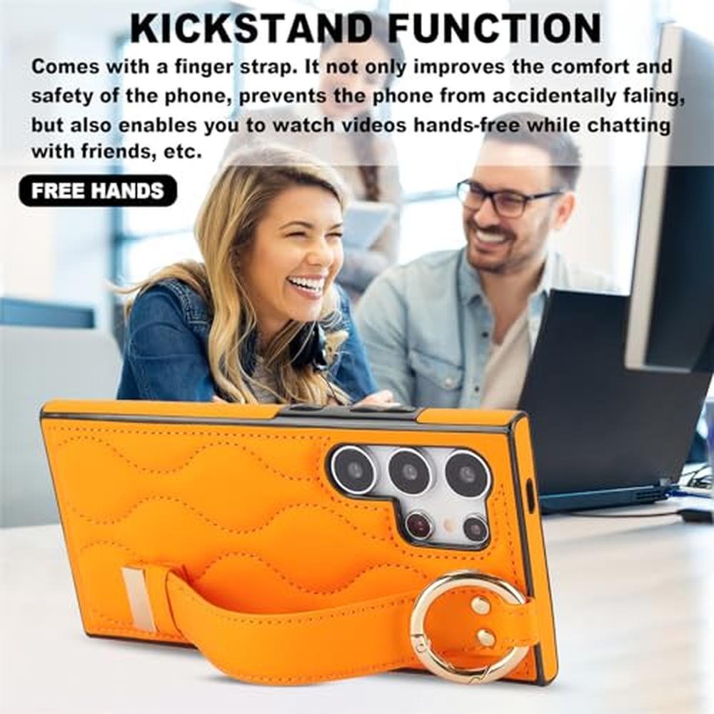 CCSmall for Samsung Galaxy S25 Ultra Case with Adjustable Wrist Strap Kickstand, PU Leather Handstrap Grip Loop Wristband Phone Cover with Ring Finger Holder Case for Samsung S25 Ultra ZWD Orange