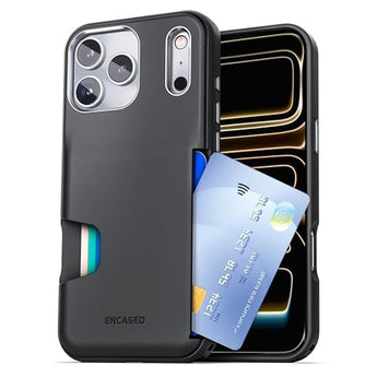 Encased Cache Wallet Case for iPhone 17 Pro The all new Cache Series wallet case offers a streamlined, functional alternative to carrying both a phone and wallet. Cards stay locked in place even when only one is stored, and the integrated access slot makes retrieval quick and effortless. Built for durability, the case uses grippy TPU and metal buttons for tactile response and drop protection, while raised edges safeguard against direct impact. Product Details: Compatible with iPhone 17 Pro Material: TPU with aluminum alloy buttons Card Capacity: 13 cards Easy eject slot Slim, pocket-friendly profile Textured grip Shock absorption Raised edges Not compatible with wireless charging