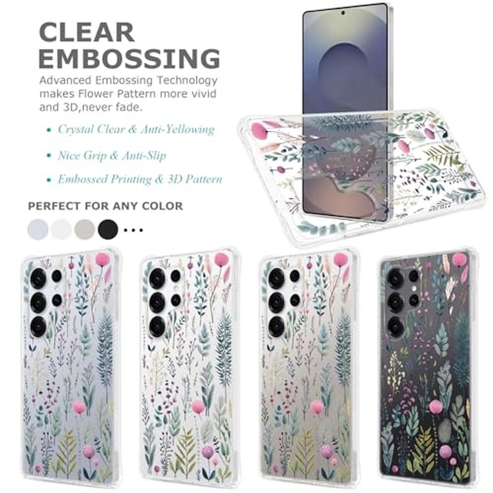 This GREATRULY Clear Phone Case with beautiful floral design and anti-slip edges is made of high quality flexible TPU and specially designed for women / girls,ultra protective for Galaxy S25 Ultra,against daily scratches,marks and scrapes,wear and tear,or drop. 3D Embossed Floral Design -- The advanced embossing printing technology makes the flower pattern 3D,more vivid,eyes-catching and almost never fades. Drop Proof -- Every corner of drop protection design protects phone more effectively from the impact of accidental fall or drop. Screen and Camera Protection -- Raised bezels provide extra protection for screen and camera,against scratches and reduce other damages. Anti-Slip -- Embossed floral print is perfectly combined with anti-slip edges,making the case non-slip,and comfortable grip. Precise Cutouts -- Precise Cutouts for camera,charger and other ports & buttons,easy access to all the controls and features,perfect fit for your phone. Wireless Charging Compatible -- This phone case supports wireless charging very well,more convenient to charge without removing the case. Compatibility -- ONLY Compatible with Samsung Galaxy S25 Ultra,NOT Compatible with Galaxy S25,Galaxy S25+ and other models. Package -- 1 x Phone Case for Samsung Galaxy S25 Ultra, Case ONLY,Cellphone or others NOT included.