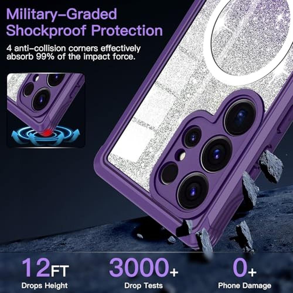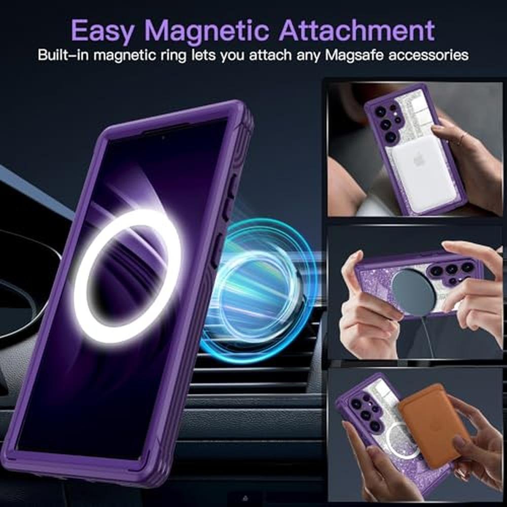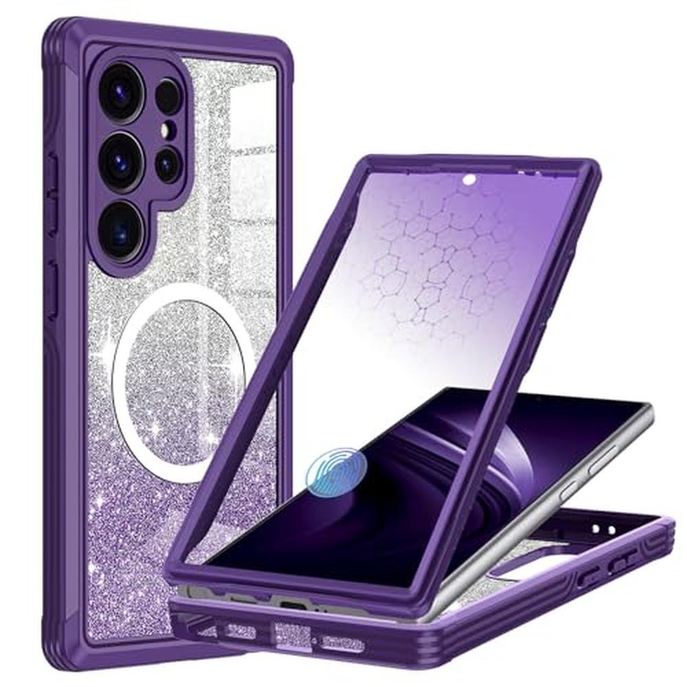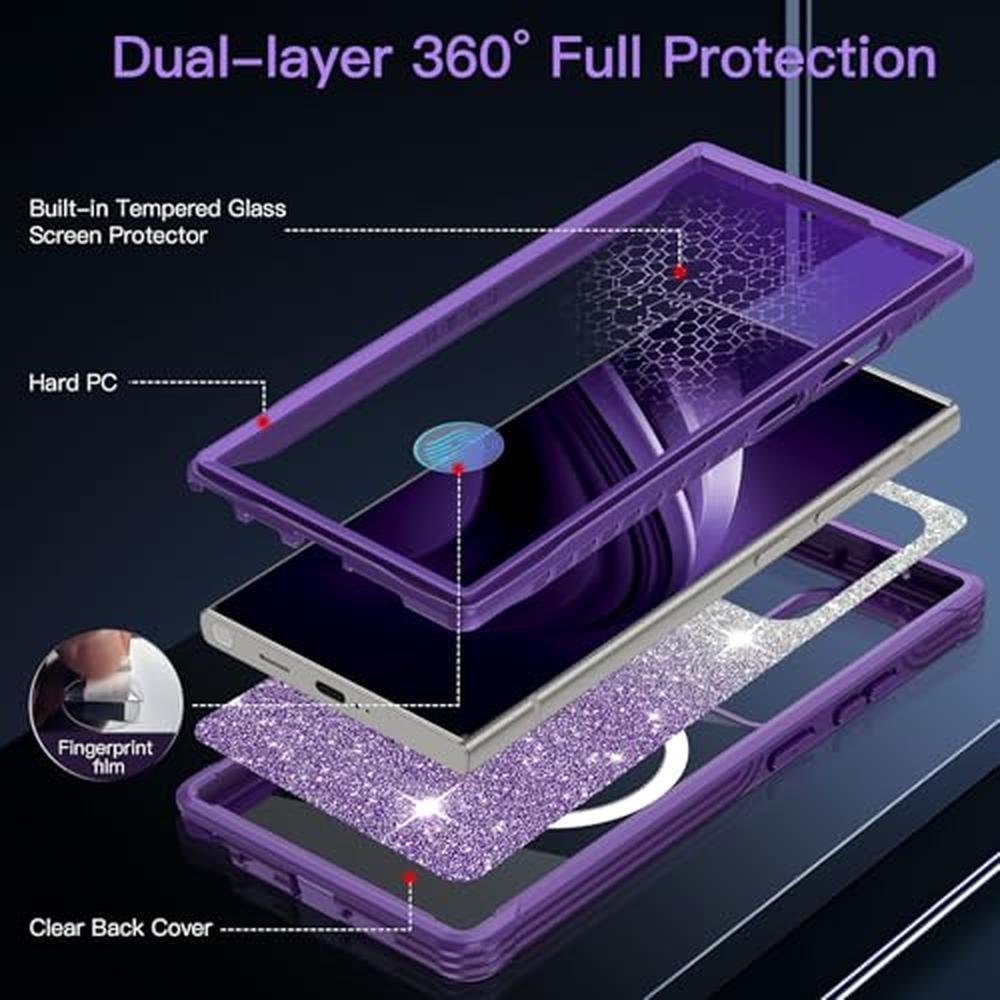 Hensione for Galaxy S25 Ultra Case,Compatible with MagSafe,Magnetic Glitter Case Built-in 9H Tempered Glass Screen Protector,Shockproof Protective Case for Samsung Galaxy S25 Ultra,All Purple