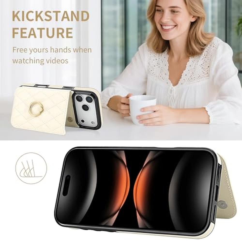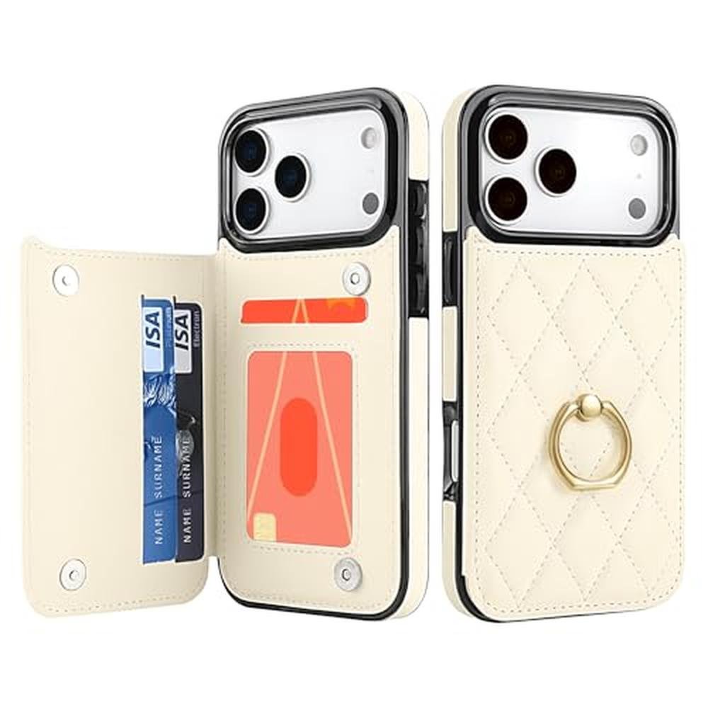 Compatibility: This wallet case only compatible with iPhone 17 Pro (6.3 inch Display, Released in 2025).For iPhone 17 Pro Card holder Case: Card slots for ID cards, credit cards, or some cash without taking a purse/bag when you go out.Kickstand Feature: Built-in 360 degree adjustable ring holder can be used as a stand to prop up the phone, also easy to grip on your finger.Full-Frame Protection and Shockproof : Covers all four corners of your Phone and raise lips and camera bevel help prevent surface scratches.Premium PU Leather: The card slots case is made from 100% handcrafted and premium leather, soft PU material brings very comfortable touch feel.Full-Frame Protection and Shockproof: This case provides reinforced 360-degree protection. Raised bezels around the corners add an extra layer of protection to your phone.Card Holder Cases : Card slots for ID card, credit cards or some cash, without taking purse to outdoor.Kickstand Feature : Built-in 360 degree adjustable ring holder to provide added security when holding the phone, kickstand function to provide hands-free viewing.