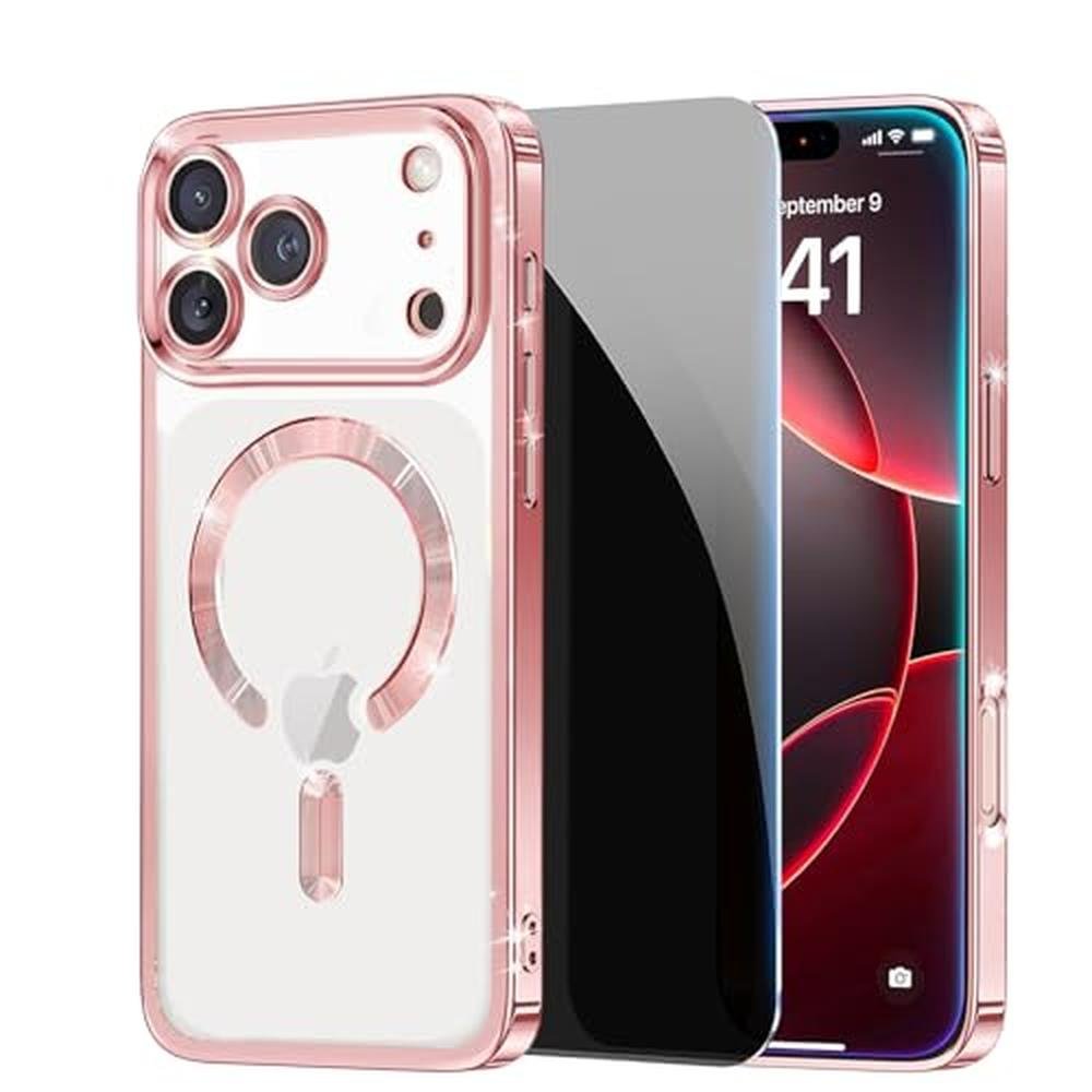 LWLFEKA Designed for iPhone 17 Pro Max Case with Privacy Screen Protectors[Non-Yellowing]Compatible with MagSafe Metallic Glossy Luxury Girl Women Cover Phone Case for iPhone 17 ProMax Cover-Rose Gold
