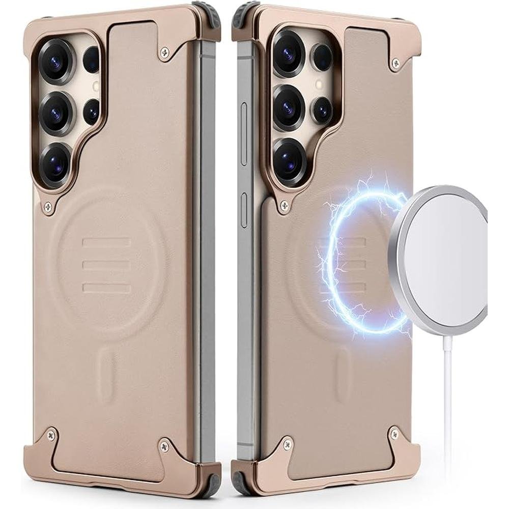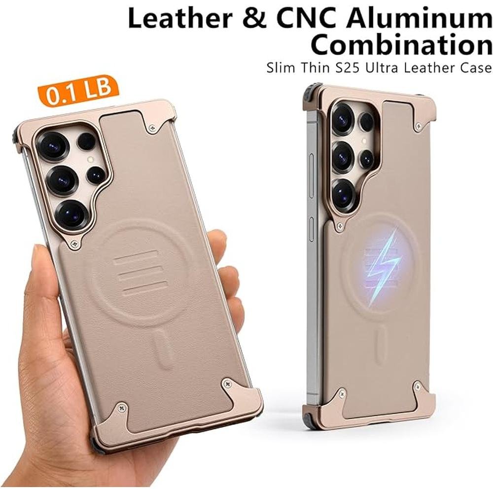Metal Leather Frameless Case for Samsung Galaxy S25 Ultra Compatible with Magsafe, Aluminum Alloy Frame Protective Minimalist Shockproof Slim Hard Ultra Thin Magnetic Bumper Cool, Desert