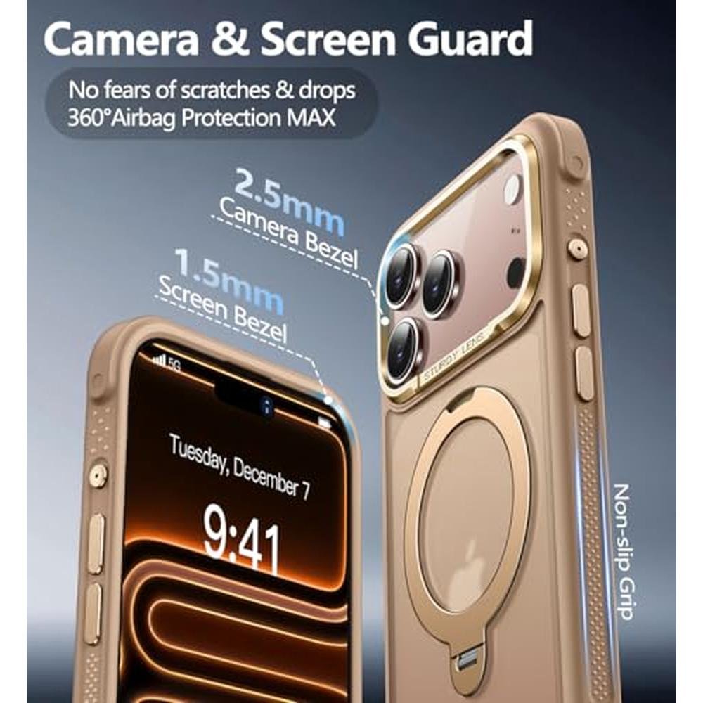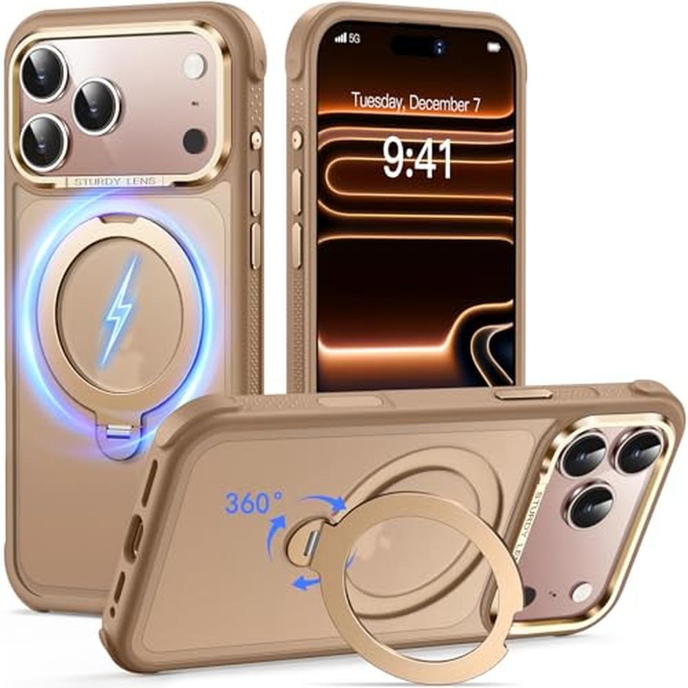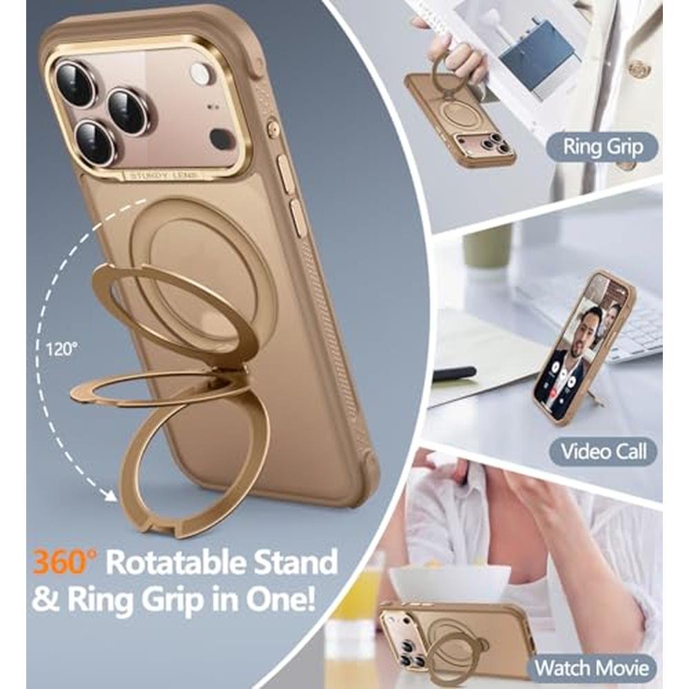 Reukdnv Magnetic for iPhone 17 Pro Max Case, Military Drop Protection, Compatible with MagSafe, Slim Translucent Matte Shockproof Protective Phone Case with 360 Spin Stand 6.9", Desert Gold