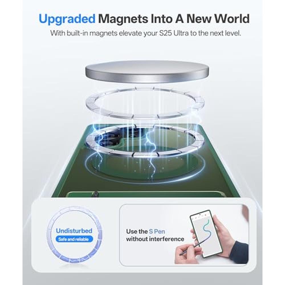 - [Upgraded Magnets Lock Magnetic Accessories] The case for S25 Ultra features magnets designed specifically for the S25 Ultra, strategically arranged to form a robust magnetic circuit, providing a stable magnetic force rated at N52. This Galaxy 25 Ultra case ensures a seamless and secure attachment of magnetic accessories, including wallets, kickstands, wireless chargers, which now effectively eliminates S-Pen interference issues, ushering in a new era of minimalist and efficient user experience