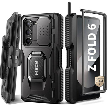 Whats in the box | 1 * Front Frame( Built-in a glass screen protector)., 1 * Galaxy Z Fold 6 Case with Spen Slot, Ring Stand, Hinge Protection and Slide Camera Cover., 1 * Removable and Rotating Belt-Clip., 1 * Pen Slot Adapter(pre-installed in s pen holder)., Tip The case doesn't support wireless charging, and S Pen is not included. |