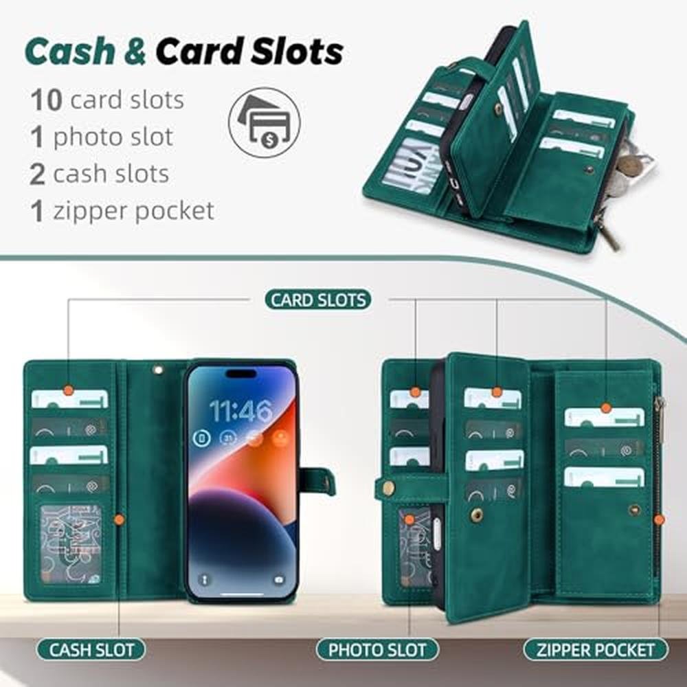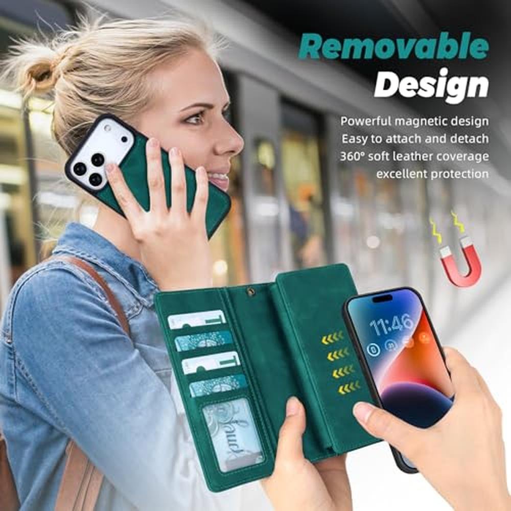 TwoHead Wallet Case Compatible with iPhone 17 Pro,Detachable,Magnetic,11 Cards Holder,PU Leather All-Round Protective Phone Case with Change Pocket(6.3 in,Green)