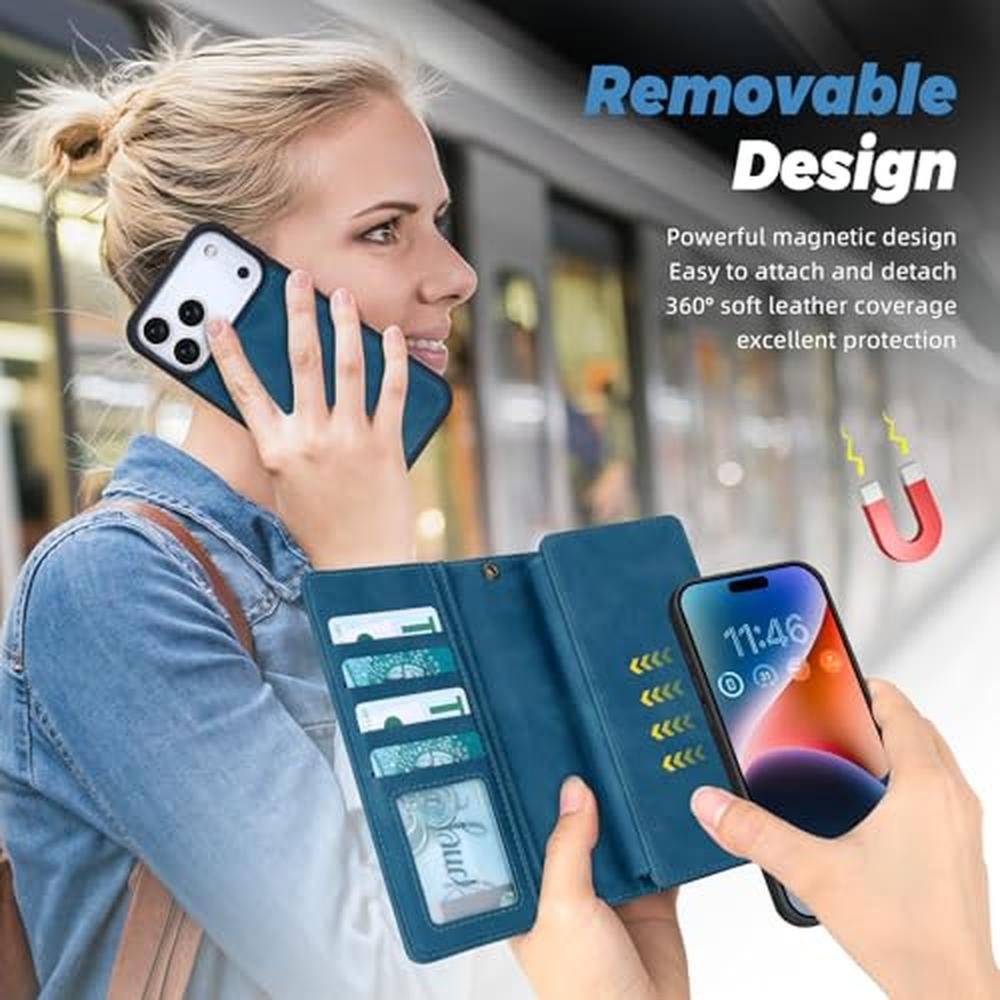 TwoHead Wallet Case Compatible with iPhone 17 Pro,Detachable,Magnetic,11 Cards Holder,PU Leather All-Round Protective Phone Case with Change Pocket(6.3 in,Navy Blue)