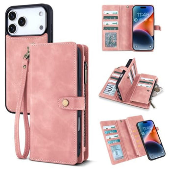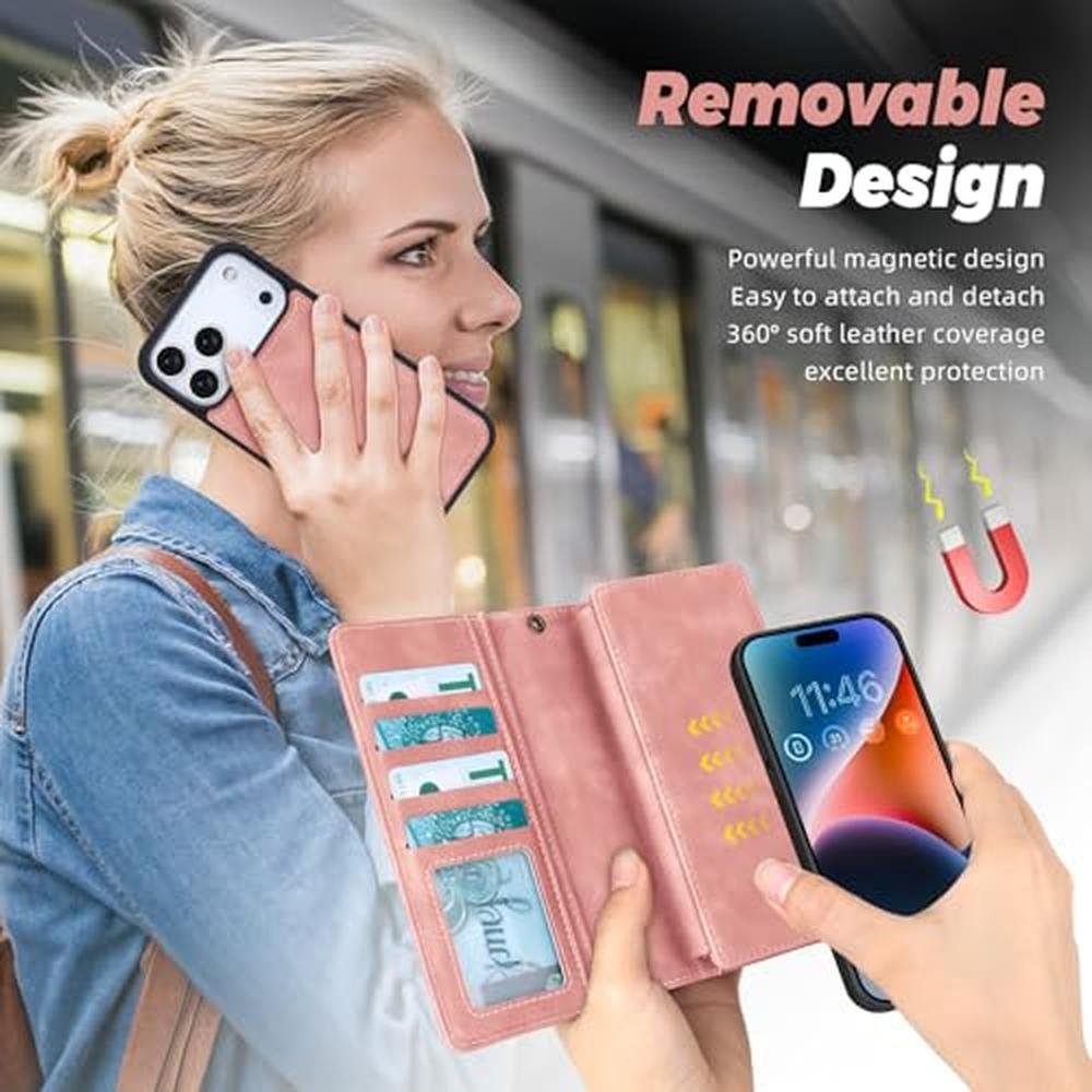 TwoHead Wallet Case Compatible with iPhone 17 Pro,Detachable,Magnetic,11 Cards Holder,PU Leather All-Round Protective Phone Case with Change Pocket(6.3 in,Pink)