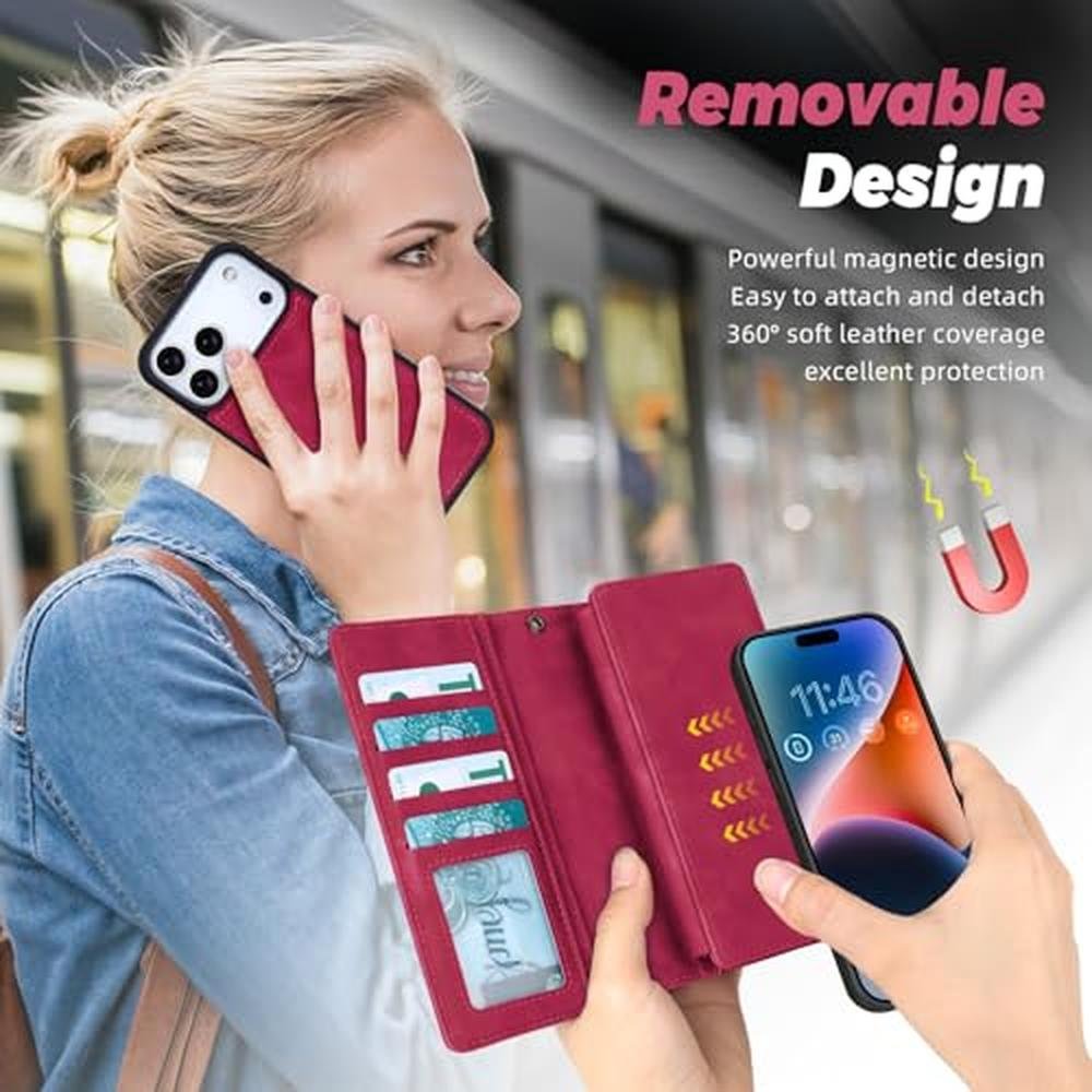 TwoHead Wallet Case Compatible with iPhone 17 Pro,Detachable,Magnetic,11 Cards Holder,PU Leather All-Round Protective Phone Case with Change Pocket(6.3 in,Wine Red)