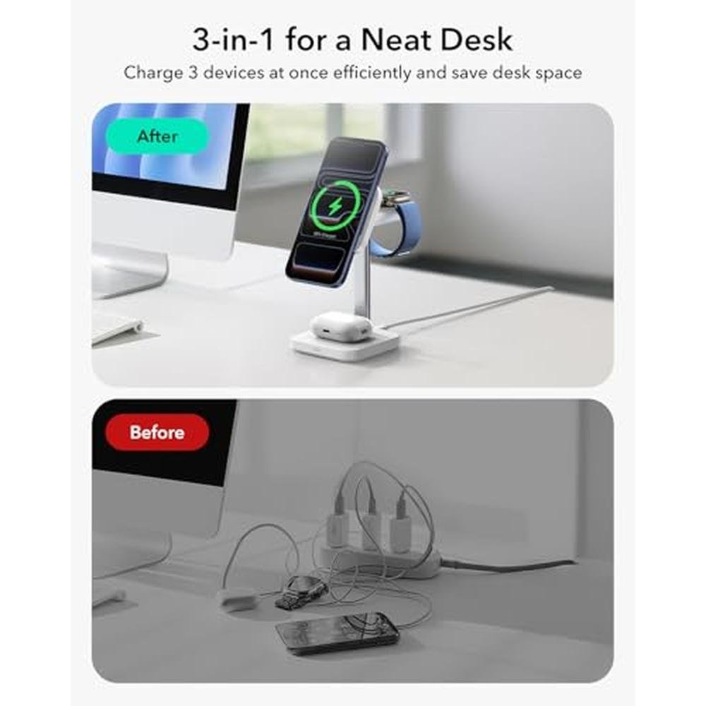 Experience the ultimate convenience of charging multiple devices at once with our premium 3-in-1 charging station, specifically designed for Apple enthusiasts. As a certified Qi2.2 charging station for multiple devices, our product stands out for its ability to fast charge your iPhone 17/16 with iOS 26, AirPods, and Apple Watch simultaneously. With its advanced CryoBoost technology, this phone-cooling fast charging station ensures that your devices charge quickly and safely, preventing overheating and damage. Ideal for use as a charging station for nightstand or desk, our product keeps your devices organized and within reach. Whether you're looking for a charging station for iPhone, a charging station for Apple products, or simply the best charging station available, our 3-in-1 charging station is the perfect solution.