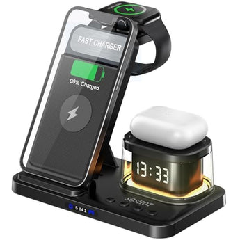 Upgrade your bedside table with the SOSHOT 5 in 1 Wireless Charger, featuring a built-in Apple clock with a sleek and modern design. This innovative device is designed specifically for Apple devices, including iPhone 15, 14, 13, 12, and 11 Pro Max, as well as Apple Watch. With its multi-functional design, this wireless charger also serves as a night light and alarm clock, providing a convenient and clutter-free solution for your daily needs. Whether you're looking for a reliable apple clock to keep you on schedule or a wireless charging station for your devices, the SOSHOT