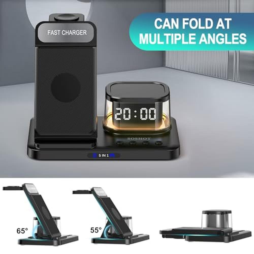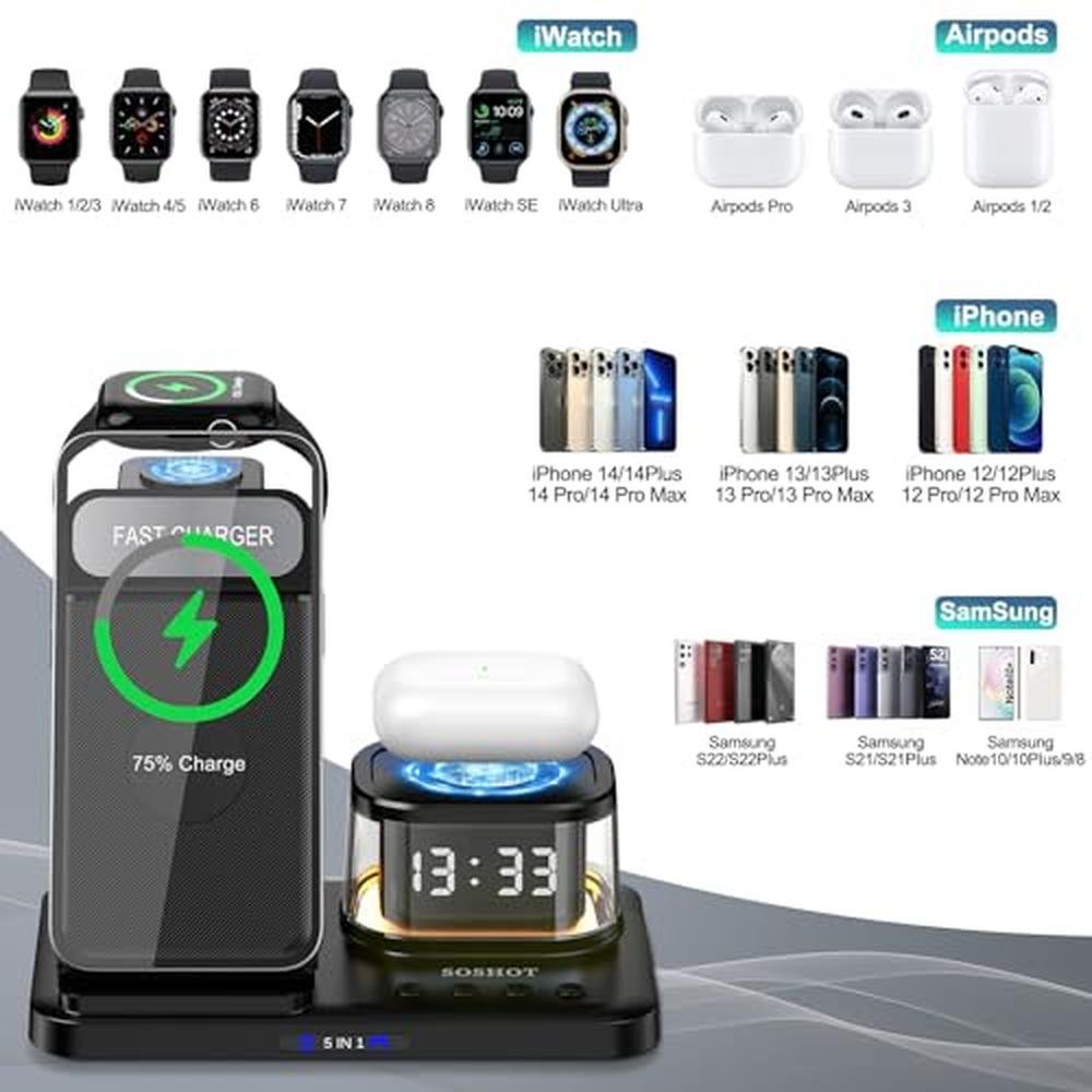 Apple Clock with Wireless Charging - SOSHOT 5-in-1 Charger for iPhone & Apple Watch