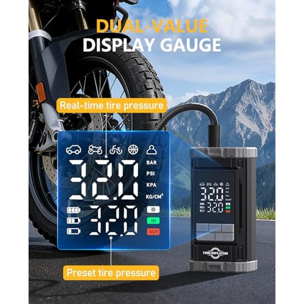 Keep your tires properly inflated anywhere, anytime with this premium portable air compressor tire inflator. This compact yet powerful device is perfect for cars, bikes, sports equipment, and other inflatables. The portable design makes it easy to store in your vehicle for roadside emergencies or routine tire pressure maintenance. Featuring a user-friendly interface and clear digital display, you can easily monitor pressure readings and achieve precise inflation levels. The device comes with multiple nozzle attachments to accommodate different valve types, making it versatile for various inflation needs. Its built-in LED light adds convenience for nighttime use, while the automatic shutoff feature prevents over-inflation. Whether you're a daily commuter, weekend adventurer, or safety-conscious driver, this tire inflator provides peace of mind and convenience on the go.