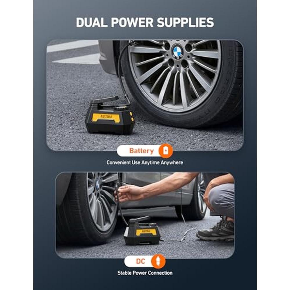 Experience the pinnacle of air pump technology with the AstroAI H2 Pro Tire Inflator, a premium and fully upgraded portable air compressor designed to cater to the needs of car, motorcycle, and bike owners. This sophisticated air pump for tires features a high-performance digital pressure gauge and rapid inflation capabilities, rendering it an indispensable tool for any vehicle enthusiast. With its dual power supplies, including DC 12V and battery options, you can effortlessly inflate your tires on-the-go, whether you're seeking an air pump for car tires or a reliable air pump for other inflatables. The AstroAI H2 Pro is a top-tier choice, redefining the standards of air pump technology with its exquisite design and superior functionality.