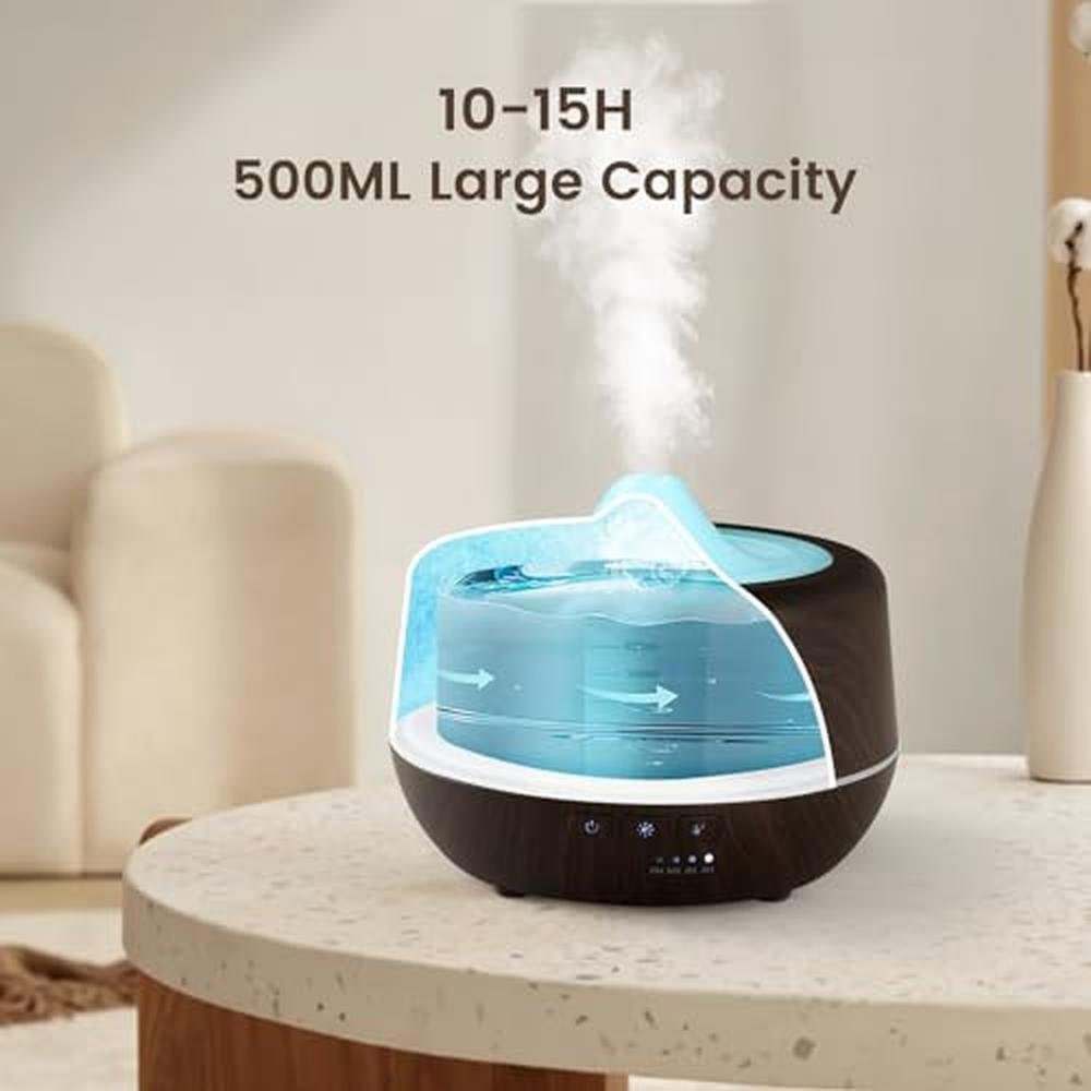 - [Large Capacity Aromatherapy Diffuser]: 500ml large capacity water Mist diffuser doesnt need to refill water frequently. This diffuser fine atomization and natural health moisturizing features can keep your room moisture and air fresh last long time. Remove dryness and boredom. You can still be fresh, natural, healthy and comfortable even in the heat of summer. Also, it suitable for large room, office and hotel .