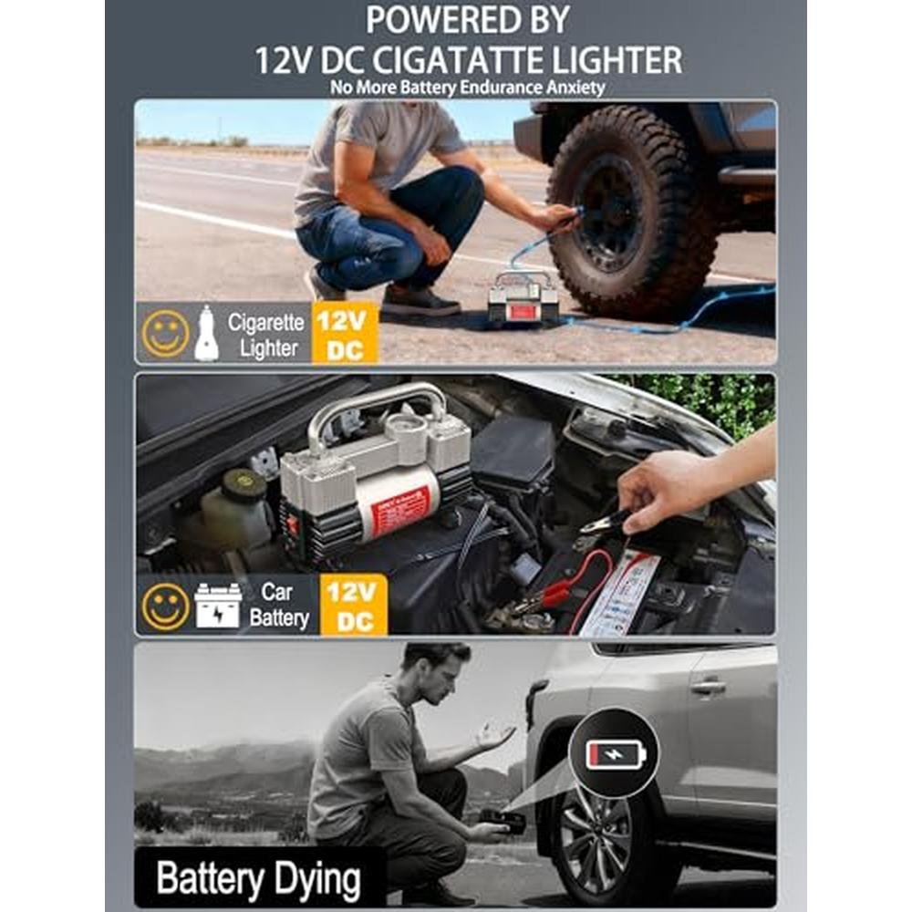 Unlock the full potential of your vehicle with the GSPSCN 6X Faster Inflation Tire Inflator, featuring a high-quality direct drive motor and sturdy metal double cylinder for low rotating speed and high efficiency. The powerful power of this pump can meet the needs of most car tires, and the high-quality cigarette lighter with built-in 25A fuse and spare fuse ensures safe and reliable operation. The 11.5ft cigarette lighter power cord and 1.8ft inflation tube provide convenient and easy use, while the high-quality screw connector can be tightly connected to the tire gas mouth.
