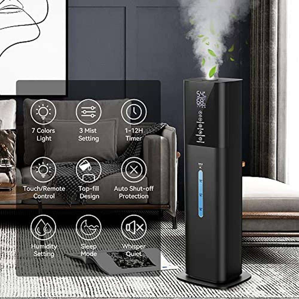 Special Feature | Easy to Operate, Easy to Clean,Customized Humidity(40%-90),12H Timer,Auto Shut-Off,8L Large Capacity,7 Colors Night Light,3 Mist Modes,4 Meter Remote Control & LED Touch Display,360 Rotating Nozzle,Top-Fill , Sleep Mode, Mist output 300 ml/h, Whisper-Quiet,Coverage area 550 sqft,With Essential Oil Diffuser |