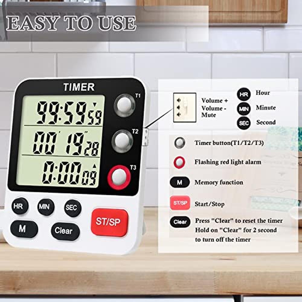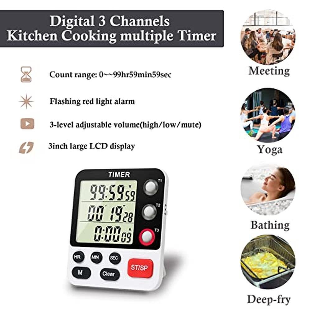 Timer | QINFIEY Digital 3 Channels Kitchen Cooking Multiple Timer with Large LCD Count-Up Down Stopwatch and 3-Level Adjustable Volume | Premium-grade Kitchen Timer for Teaching and Cooking
