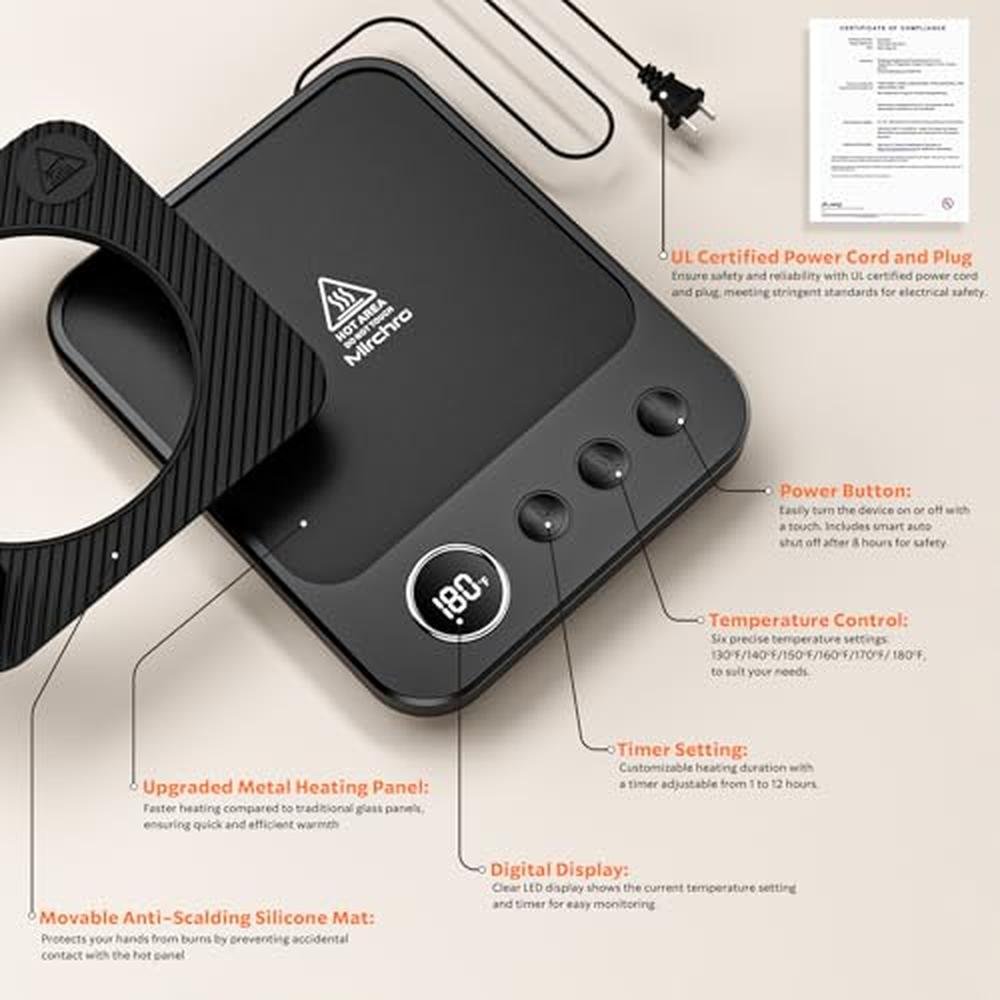 - Set It and Forget It! | With the Mirchro Coffee Mug Warmer's timer AUTO ON/OFF feature, you can enjoy hot coffee anytime. Equipped with a display screen and touch control buttons, you can customize the on/off time from 1 to 12 hours. Whether you're working at your desk, relaxing at home, or taking a break, the Mirchro Mug Warmer ensures your drink stays at the perfect temperature. Enjoy your coffee just the way you like it, whenever you want.