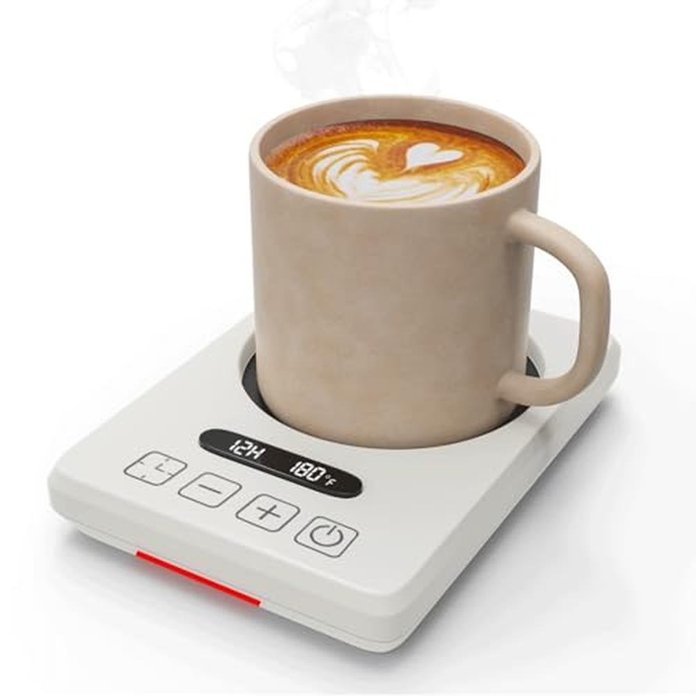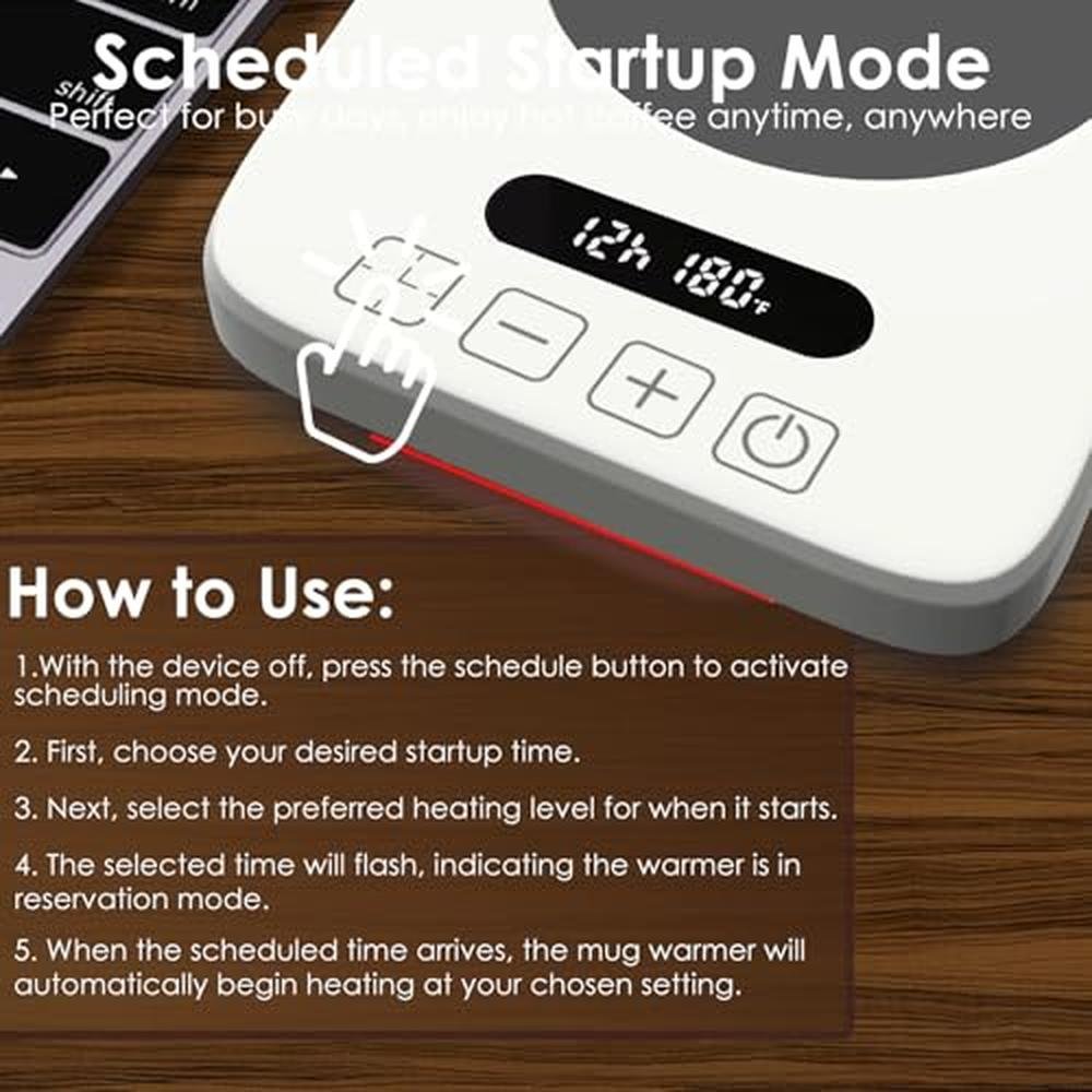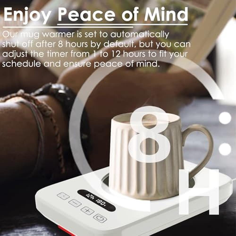 - Smart Timer: This coffee cup warmer has an automatic on/off timer so you can set it to match your schedule. Just press the power button when its off to schedule a start time, and it will turn on as planned. By default, it shuts off after 8 hours, but you can adjust the timer from 1 to 12 hours for peace of mind. Whether you need it for a few hours or all day, the timer adapts to your routine