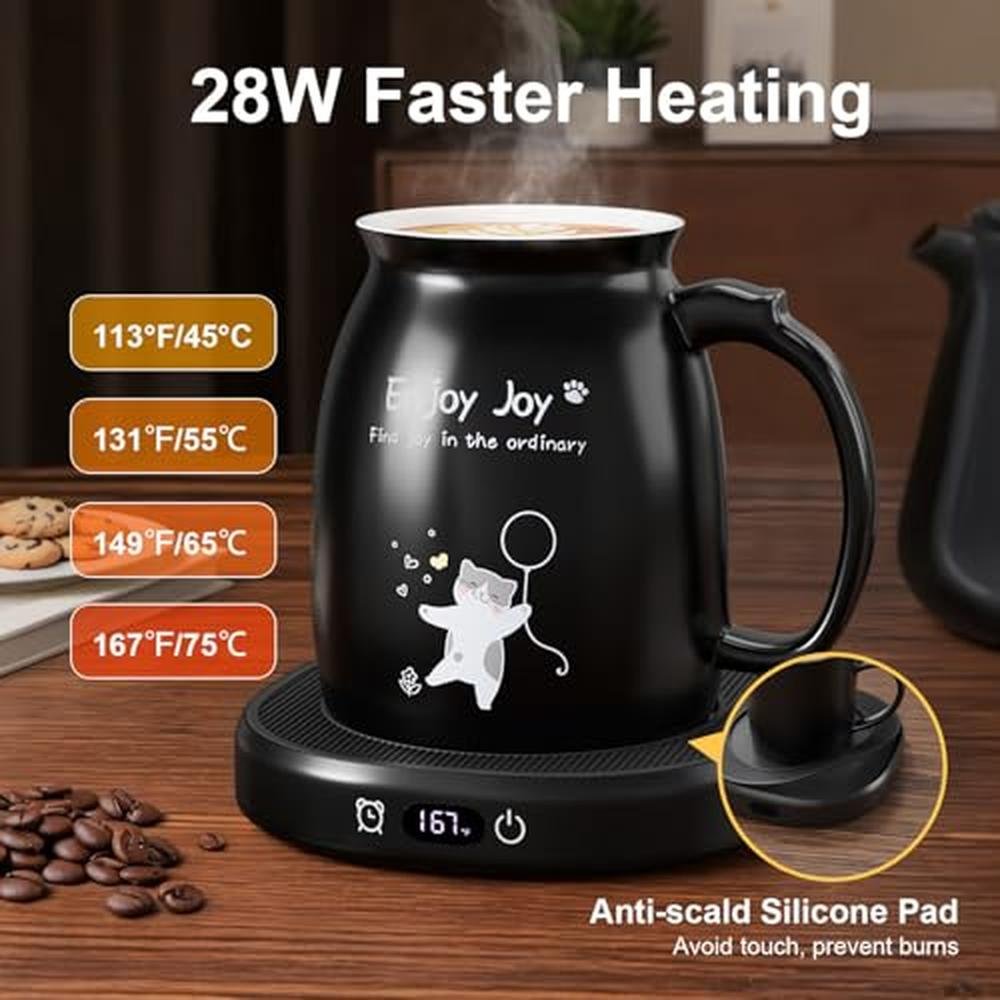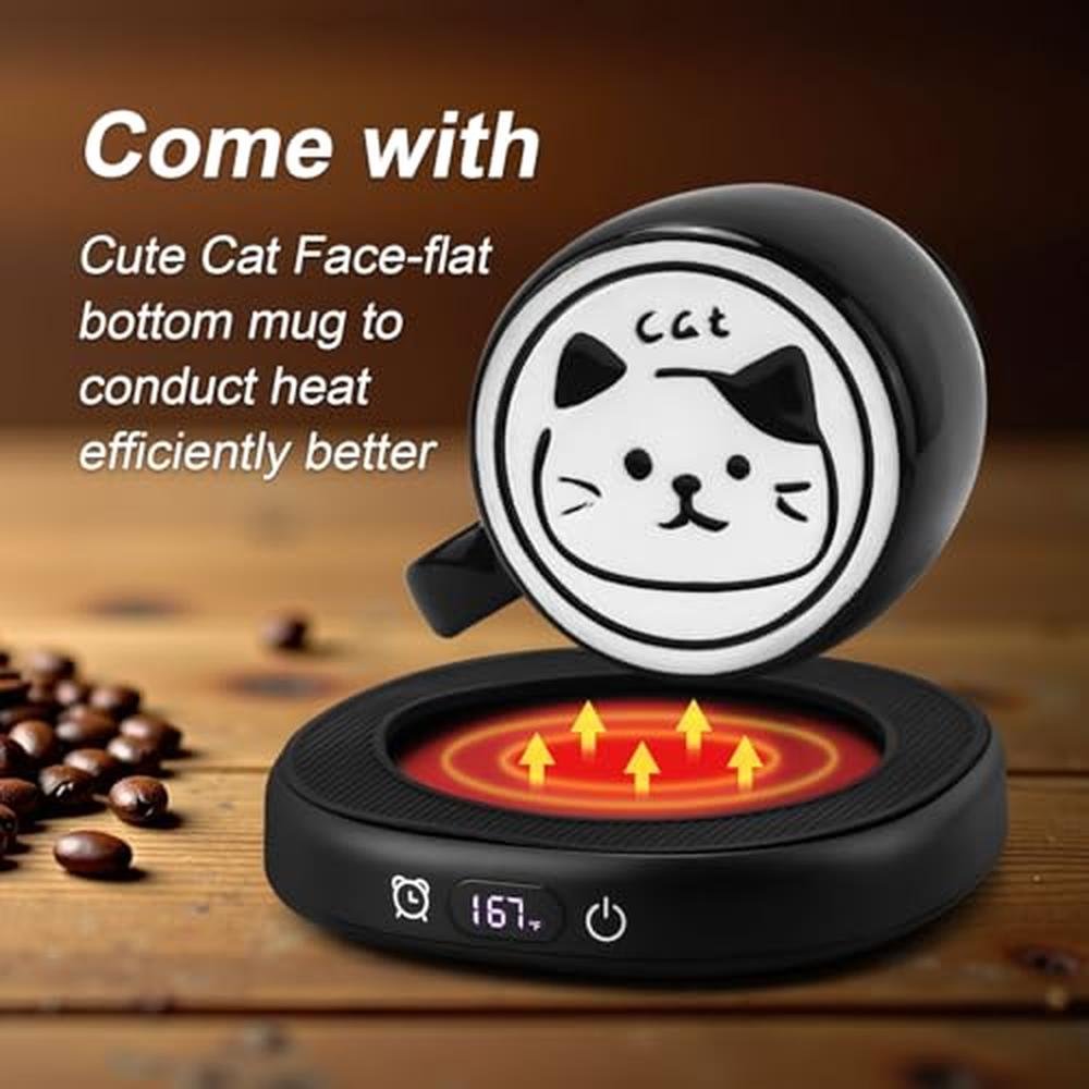 - Come with Cute Cat Mug: Bsigo coffee mug warmer set included with ceramic cute cat cup and spoon. Place a wooden lid to cover the mug will also help retain heat. Every warmer comes with an Anti-scald silicone pad which prevents accidental contact while heating. The silicone mat is removable to allow for bigger-based mugs to be used on the heat pad. Note: Using a flat or thin bottomed mug will give the best results. Bring warmth, joy and safe to your love ones and families with Cat Cup Warmer Set