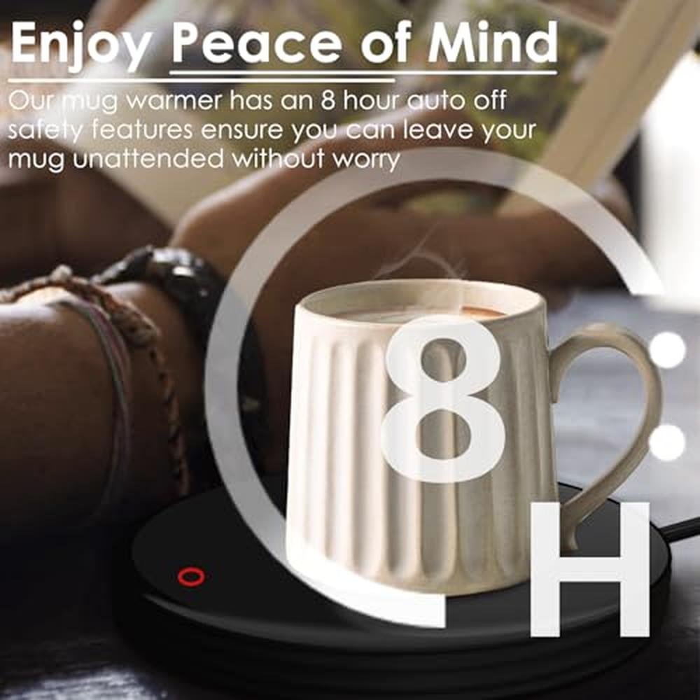 - SAFETY ASSURED: This 18W low power mug heater is energy efficient, minimizing electricity waste. You don't need to worry if you forget to turn it offthe coffee warmer plate automatically shuts off after 8 hours of maintaining the set temperature, giving you peace of mind