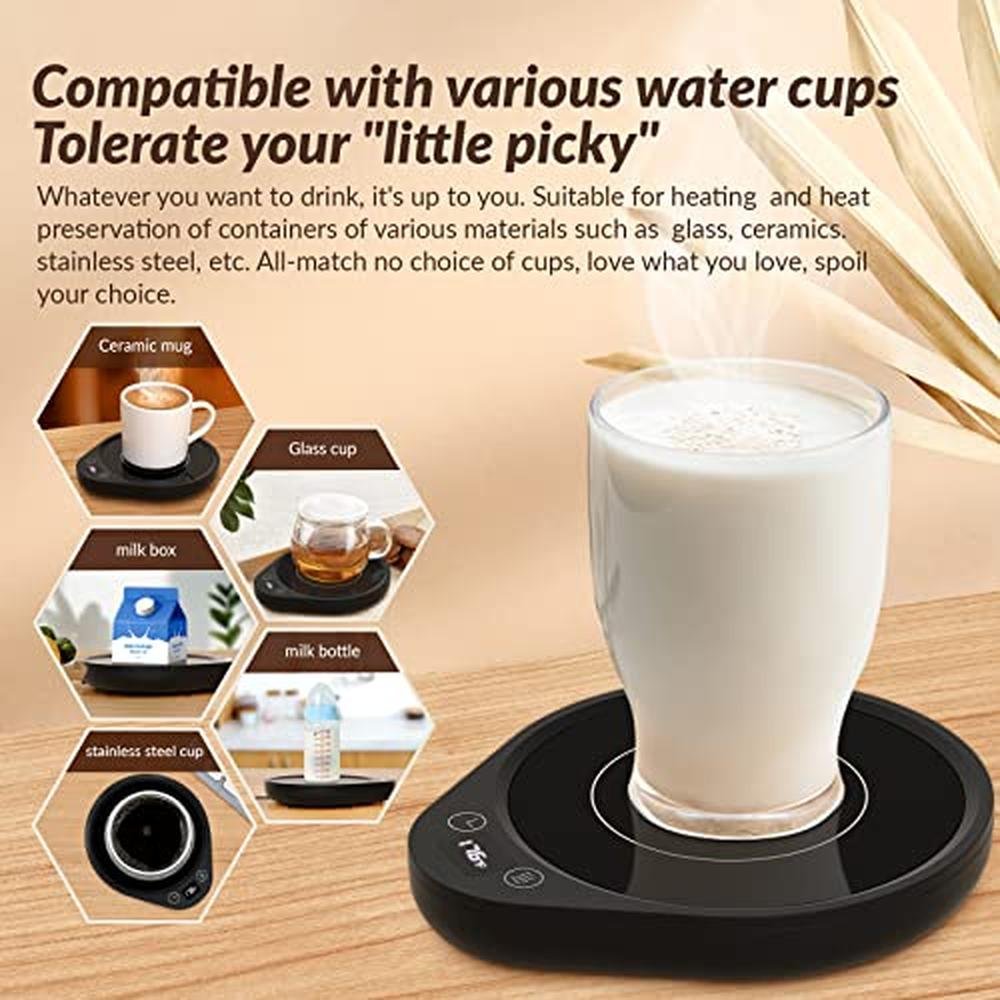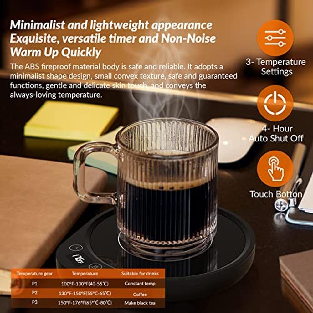 - 3-Temperature Settings Keep Coffee WarmOur coffee cup warmer can slow down the cooling speed of hot beverages; mainly keep your coffee, water, milk, tea, and other beverages at the perfect temperature for a long time, you can enjoy your favorite drinks at the perfect but not-too-hot temperature.You can choose the temperature by touching the "Temp Button" to keep or warm up the temperature of the drink to 130 F/150 F/176 F.