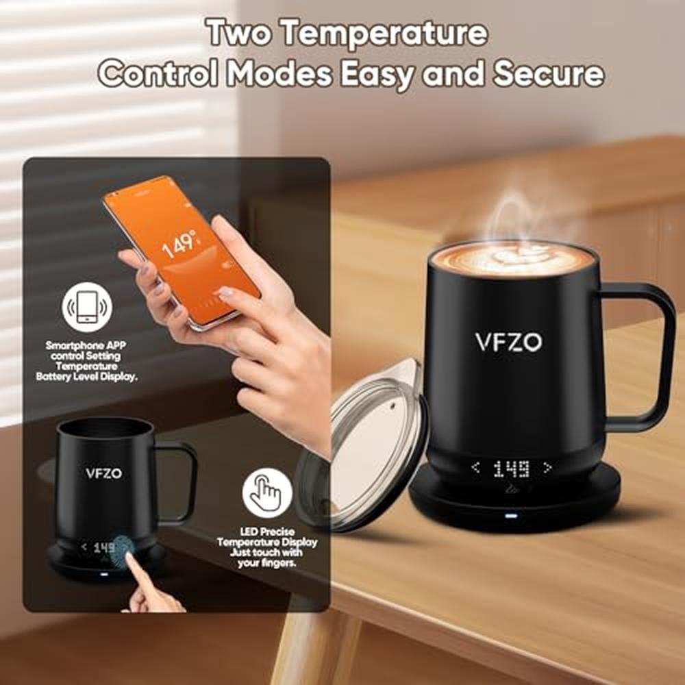 - Improved Design The VFZO smart coffee mug adopts professional heating technology.VFZO Smart Coffee Cup - Durable Battery (4000mAh) LED real-time temperature display settings.Safe and reassuring - When there is no liquid in the coffee cup, the self heating mug will automatically stop heating.Best Partner - Whether it's for work or travel, you can always bring it with you and enjoy a warm hot drink.