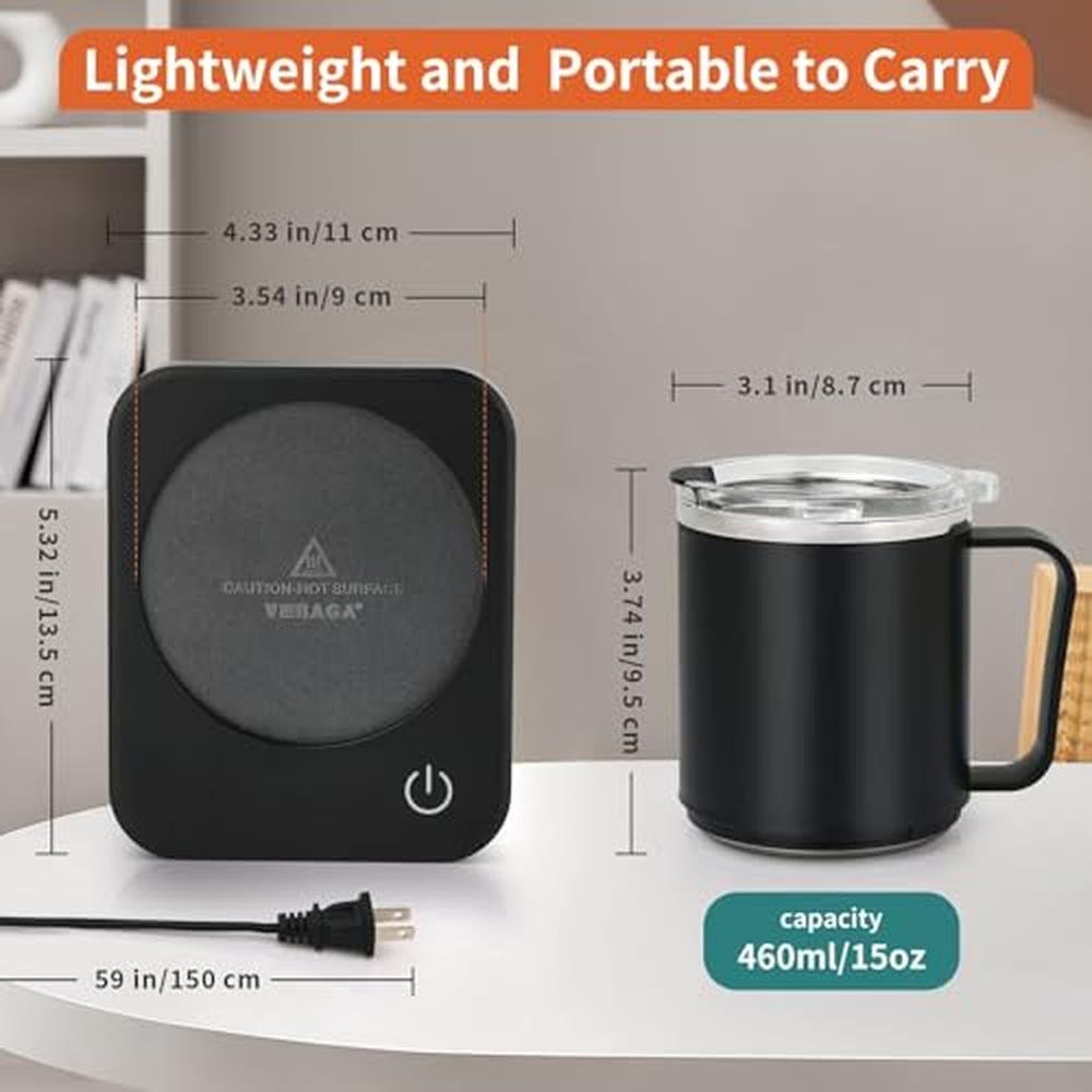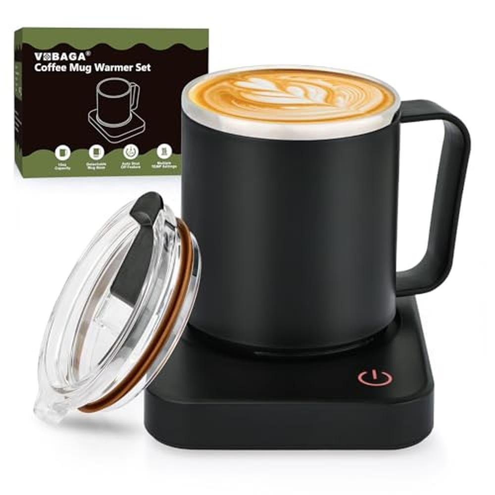 - Whats in itVOBAGA mug warmer set includes a coffee warmer and a 15 oz stainless steel coffee mug. The best heating effect is achieved when they work together, which is designed for coffee lovers who like their coffee super hot.