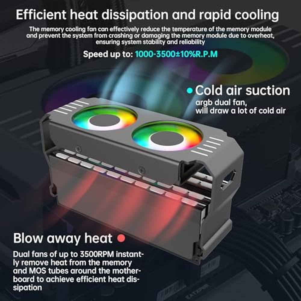 EFFICIENCY OF MEMORY HEATING FAN This ARGmemory heatsink memory cooling fan is designed for PC gaming and is the best choice for memory cooling solution. High Airflow Dual fan design memory cooler provides high quality and high performance for gaming. 5V 3PIN ARGSynchronized Memory Fan This memory cooling fan is equipped with addressable ARGLED lights, making your computer case colorful and inging you the ultimate visual experience.