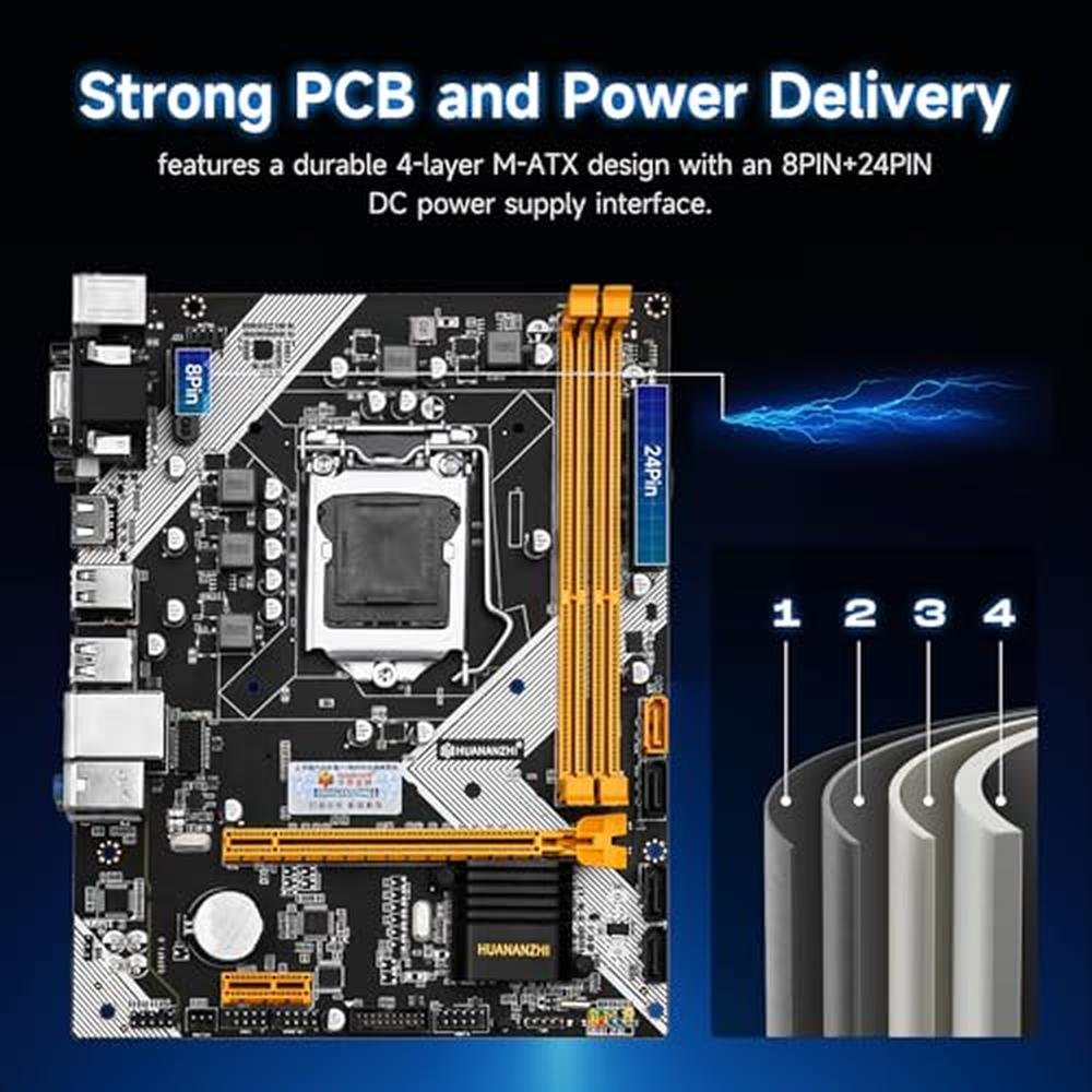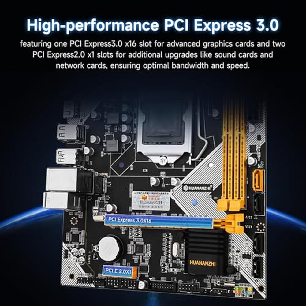• Strong PCB and Power DeliveryThe HUANANZHI gaming PC motherboard features a durable 4-layer M-ATX design with an 8PIN+24PIN DC power supply interface. With the use of all-solid capacitors and optimized power circuit layouts, it ensures precise and stable current delivery to the CPU, contributing to reliable performance and longevity.
