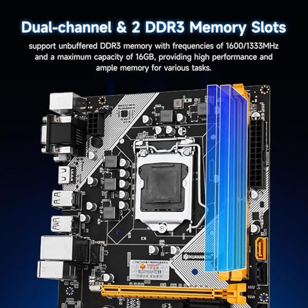 • Dual-channel DDR3The HUANANZHI computer motherboard comes with 2 DDR3 memory slots, supporting dual-channel architecture. These slots support unbuffered DDR3 memory with frequencies of 1600/1333MHz and a maximum capacity of 16GB, providing high performance and ample memory for various tasks.